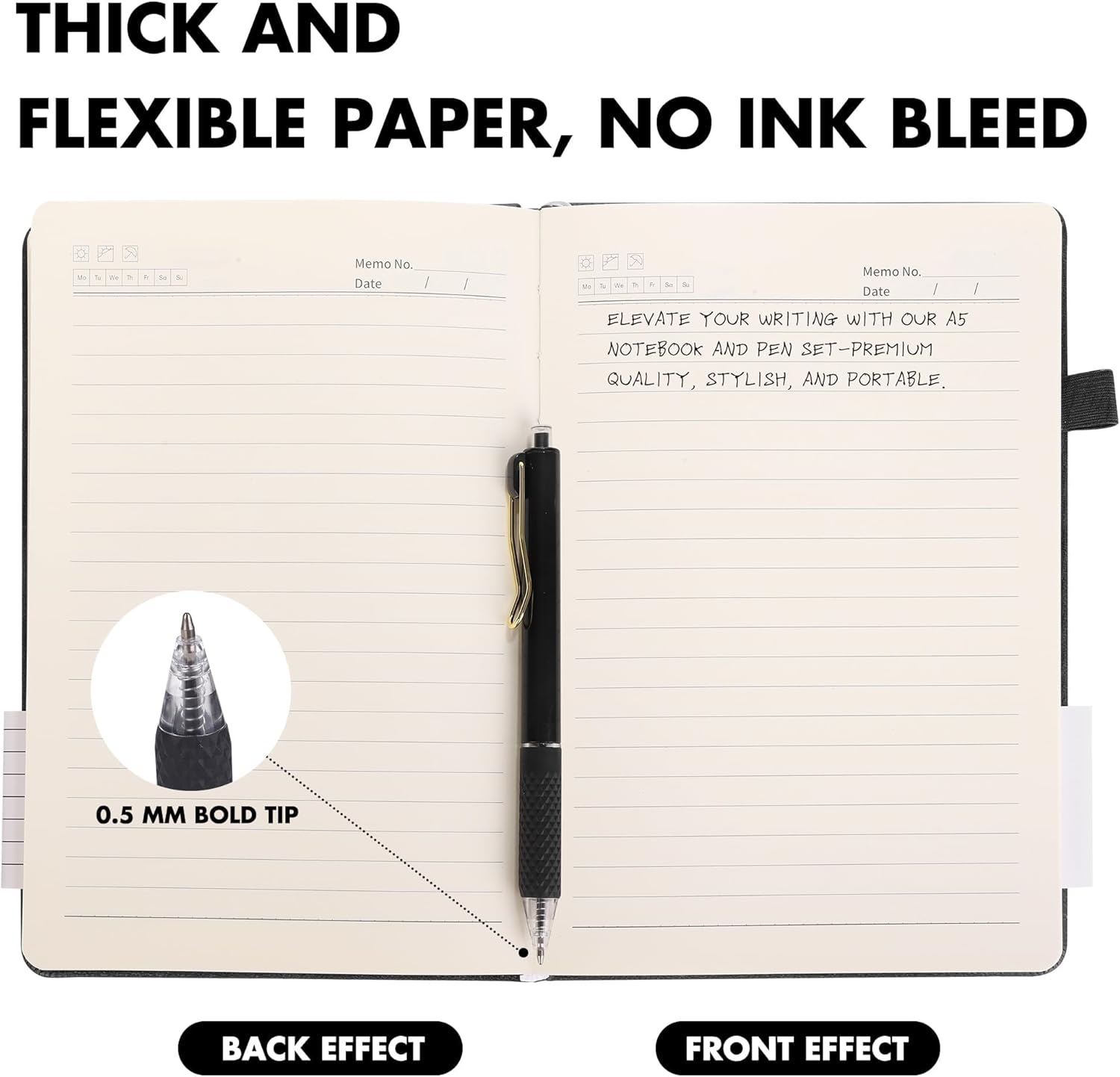- Quality leather & paper: our A5 notebook is made of 100 gsm thick paper, providing a smooth touch and resisting ghosting and bleeding, compatible with most pens, pencils and markers; the lined journal notebook with pen feature premium PU leather hardcover, waterproof and easy to clean, helping the notebooks stay upright without the pages curling or bending; the ballpoint pen is designed with a 0.5 mm bold tip for smooth, non-leaking drawing, ideal for use with the journal
