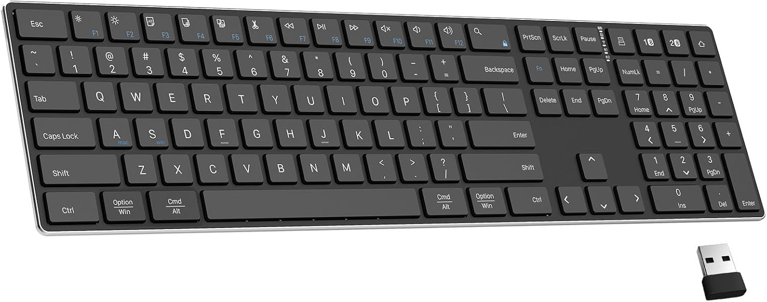 2.4G Wireless and Bluetooth Keyboard with Numeric Keypad, Multi-Device, Rechargeable, Compatible with Mac, Windows (Black)