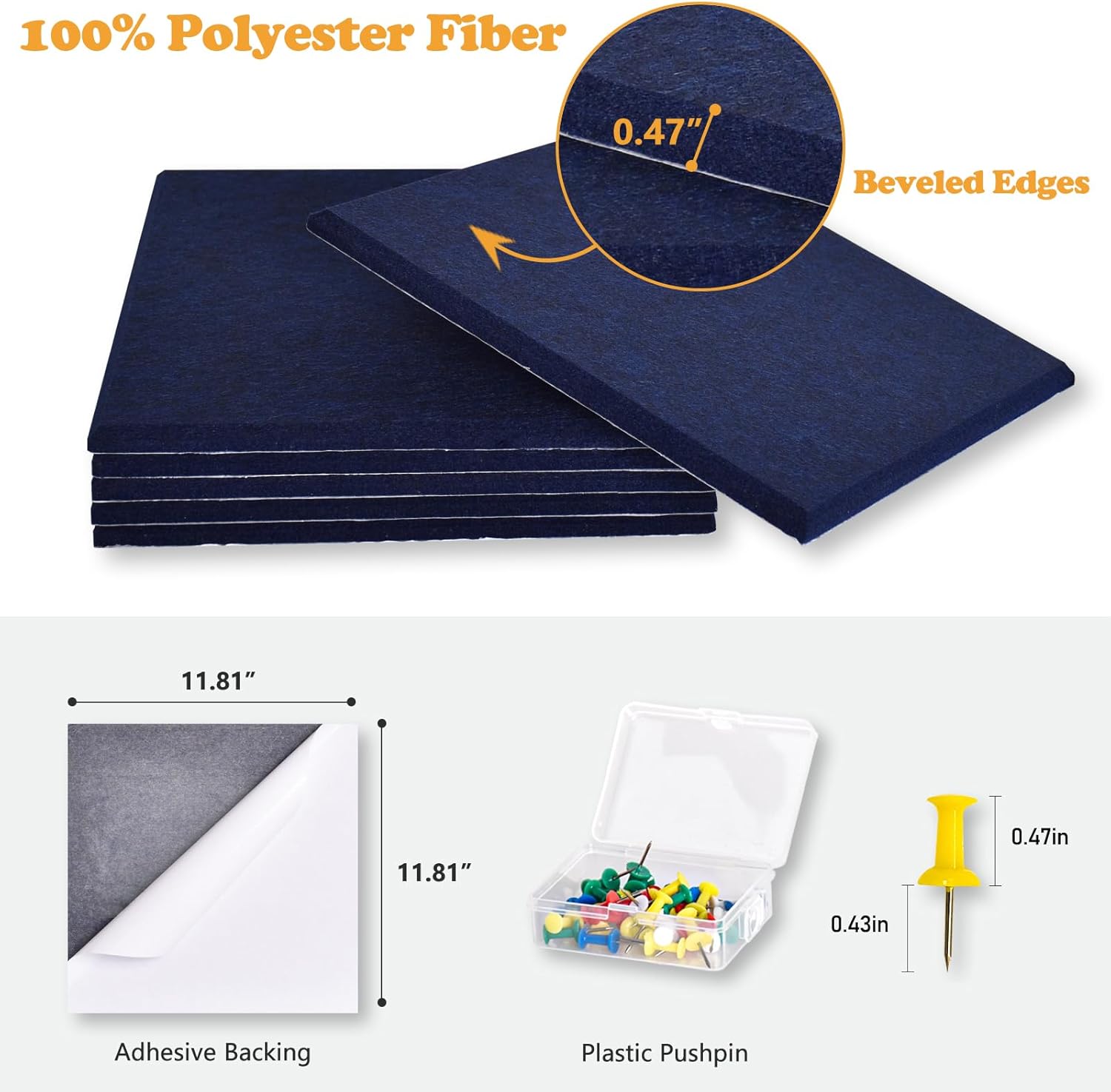 Thick Cork Board for Wall with Pins, 36" x 24" Bulletin Board Self-Adhesive Pin Board | Customized 6 Packs Felt Tiles for Office Home Wall Decor, Navy