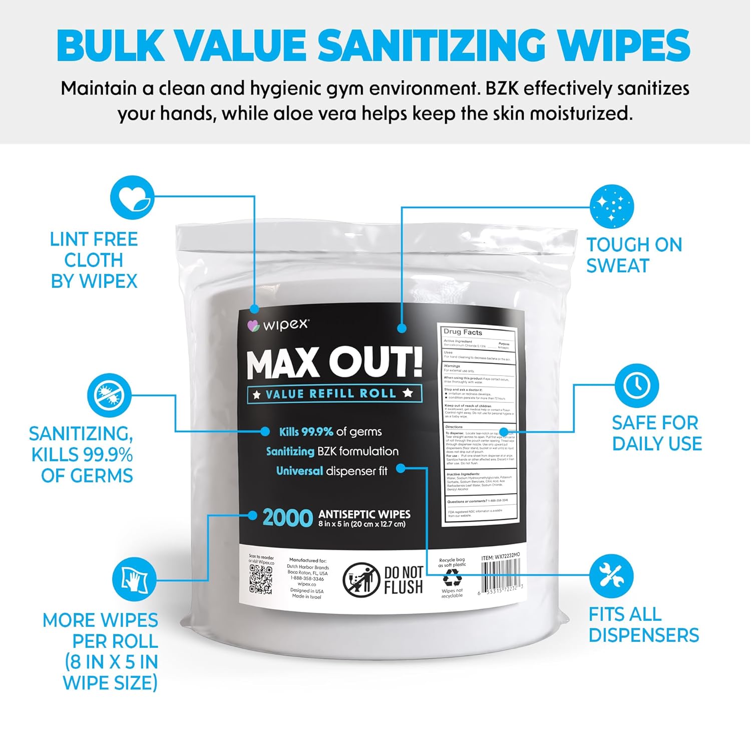 - Max Out Economical Fitness Wipes: Experience cost-effective hygiene with our pallet size of Wipex Refill Rolls made with BZK. Each roll contains 2000 gym equipment wipes, ensuring a long-lasting supply of essential gym supplies for your facility's cleanliness. 120 Rolls delivered on pallet.