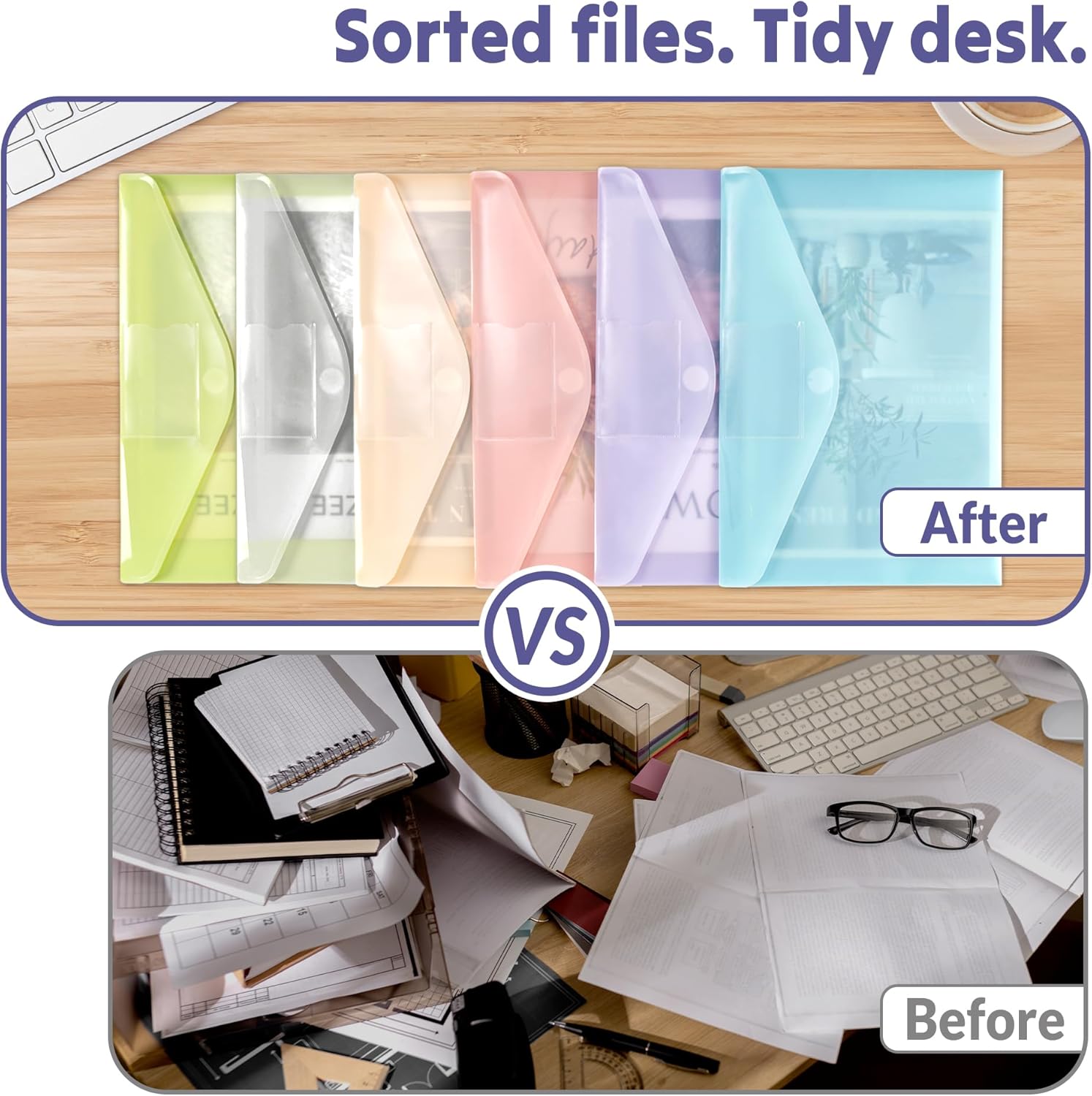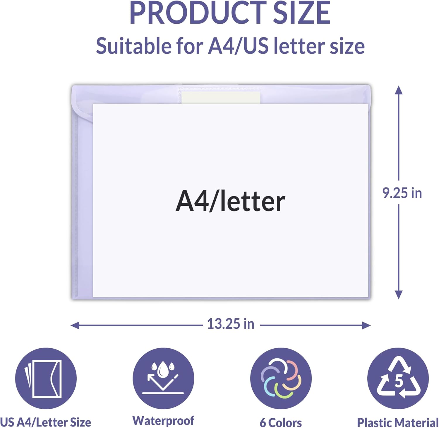 - Colored File Folders: 24 pack of plastic pocket folders features six elegant macaron shades: Pink, Yellow, Lavender, Green, Blue, and Clear. The professional 9.25"x13.25" size fits A4/Letter paper. With reinforced closure and an exterior label pocket, these plastic file folders letter size protect documents. Please Note: Label cards not included