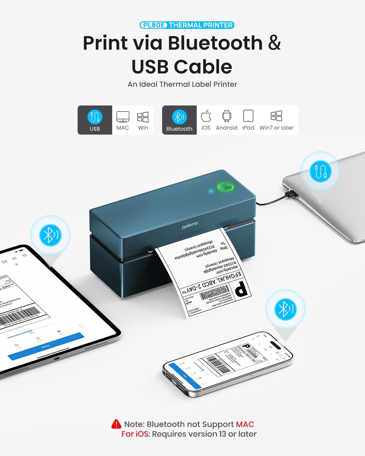 - 2025 New Version: POLONO Bluetooth thermal printer offers faster and clearer printing. The PL80E Bluetooth thermal printer is a high-speed shipping label printer, printing up to 72 labels/min for 4x6-inch labels. This thermal printer works with fanfold and roll labels (0.97"-4.25" width) and delivers 203 dpi high-resolution prints. An ideal choice for shipping and logistics, this shipping label printer ensures efficient, clear results. Note: Monochrome printing only. If nothing prints on 4×6 labels, make sure the paper is face up and select 100x150 mm