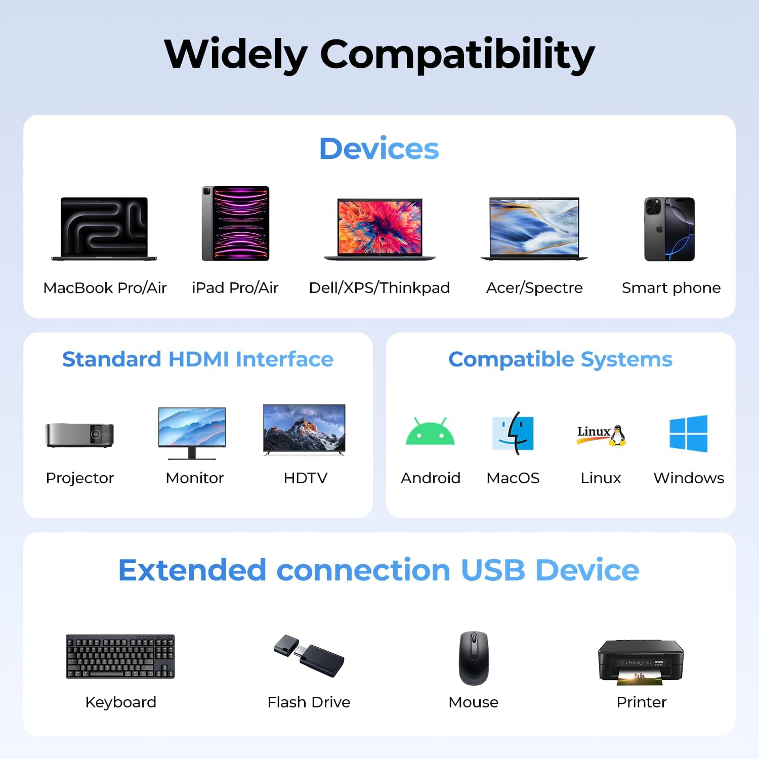 - Wide Device & OS Compatibility: Engineered with premium aluminum housing for durability and superior heat dissipation, this USB-C to HDMI adapter boasts exceptional compatibility. Works seamlessly with laptops (MacBook Pro/Air, Dell XPS, HP, Acer, Surface), tablets (iPad Pro/Air), smartphones, Nintendo Switch, and Steam Deck across Windows, ChromeOS, Linux, and macOS 10.5+. Note: Not compatible with iPhone/iPad (Lightning port) and Samsung A series phones.