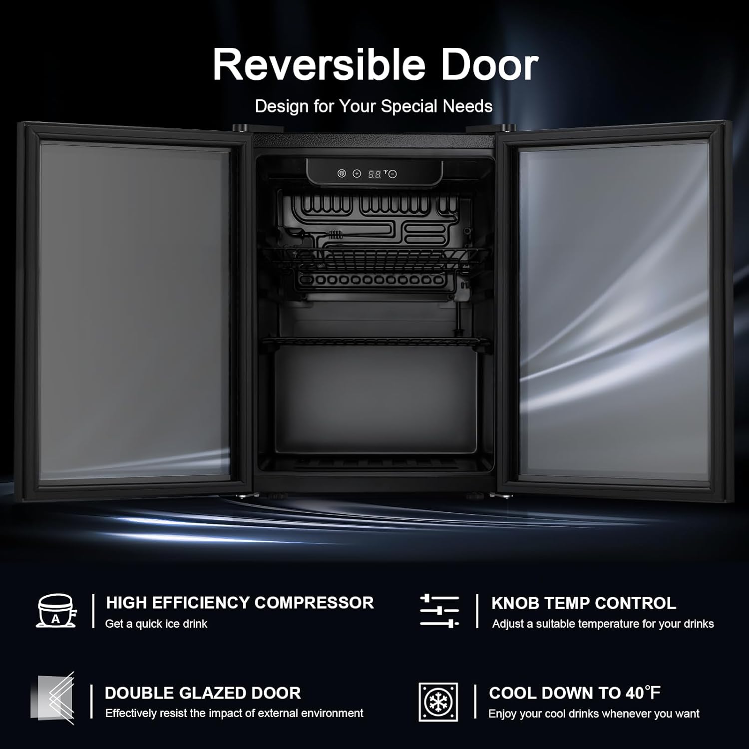 - Intelligent Control:The mini refrigerator has digital Thermostatic controls to adjust the temperature between 40°F-61°F with an easy-to-use digital display. The coolers for home feature a special compressor technology that keeps the temperature constant regardless of the outer oscillations.