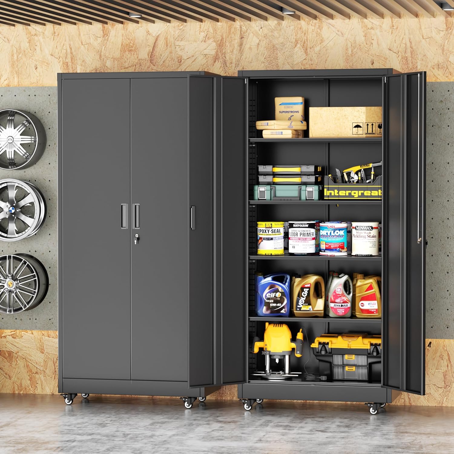 - ✅【EASY TO MOVE】Our garage storage cabinet has four lockable wheels that can be rotated 360 degrees, You can easily move it anywhere you want without worrying about being out of control. (adjust up to move, adjust down to lock)