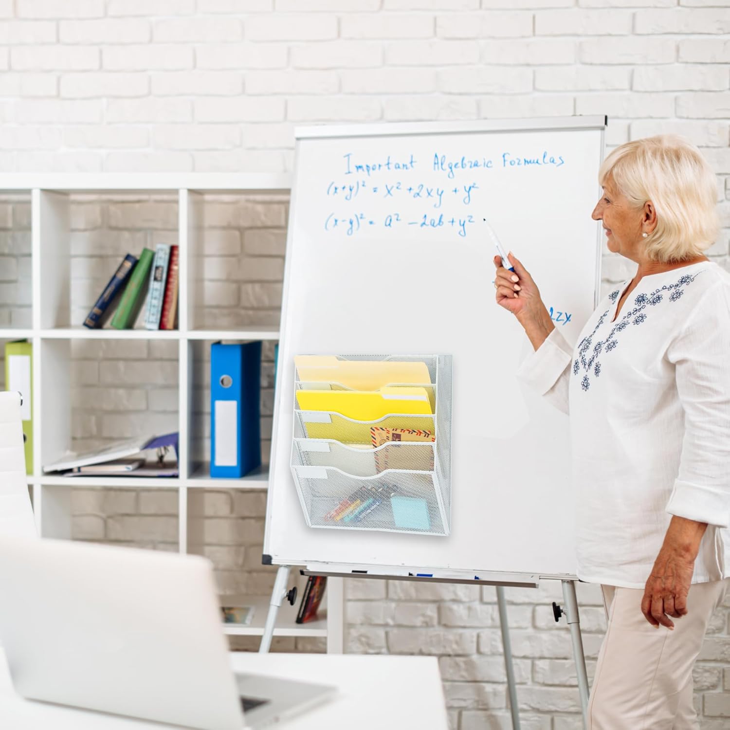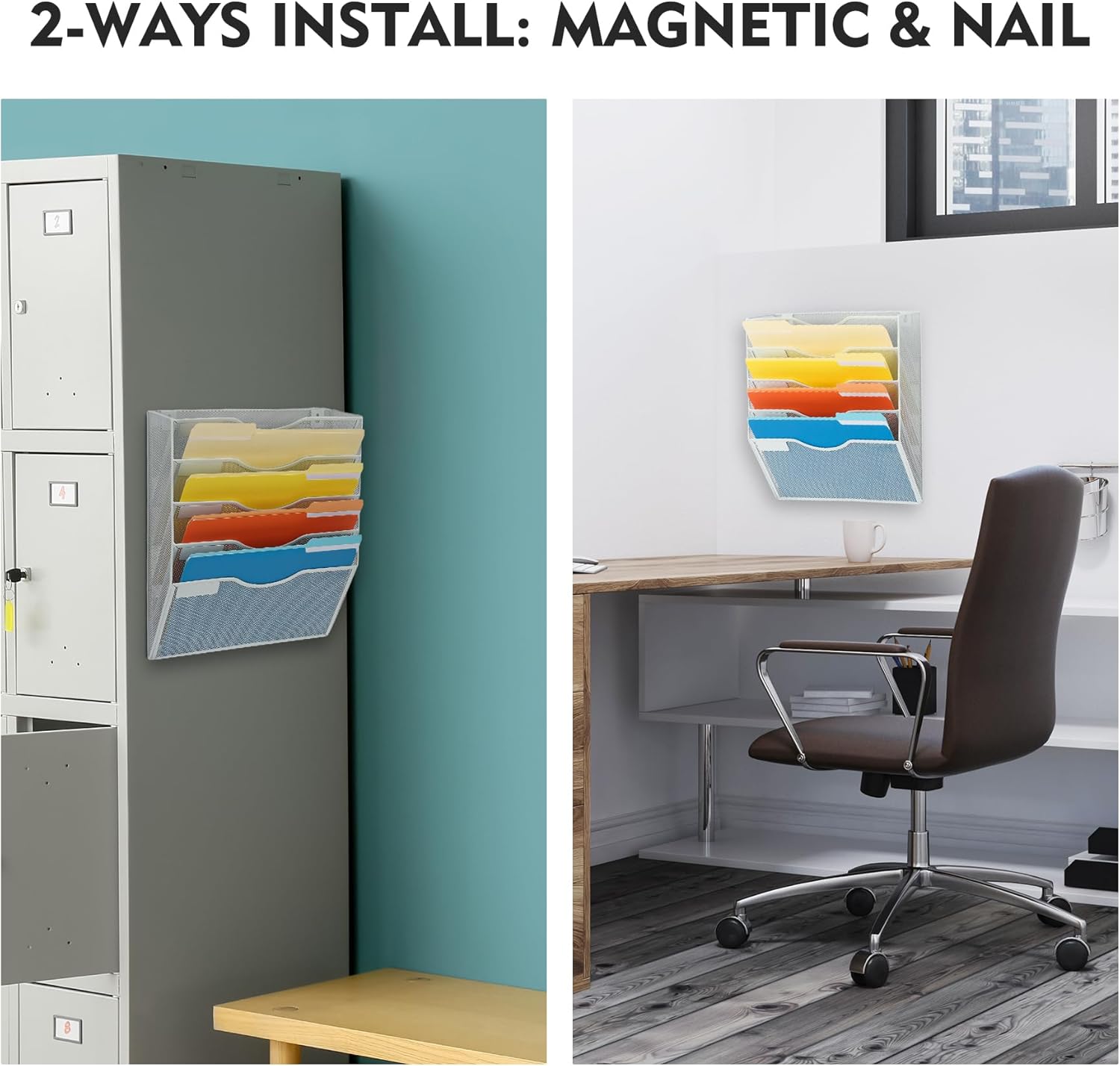 EASEPRES Magnetic 5 Pocket Mesh Hanging File Organizer, Wall Mounted Mail Paper Document Folder Holder, Clipboard Storage Organization Magazine Rack with Nametag Label for Office Home School, White