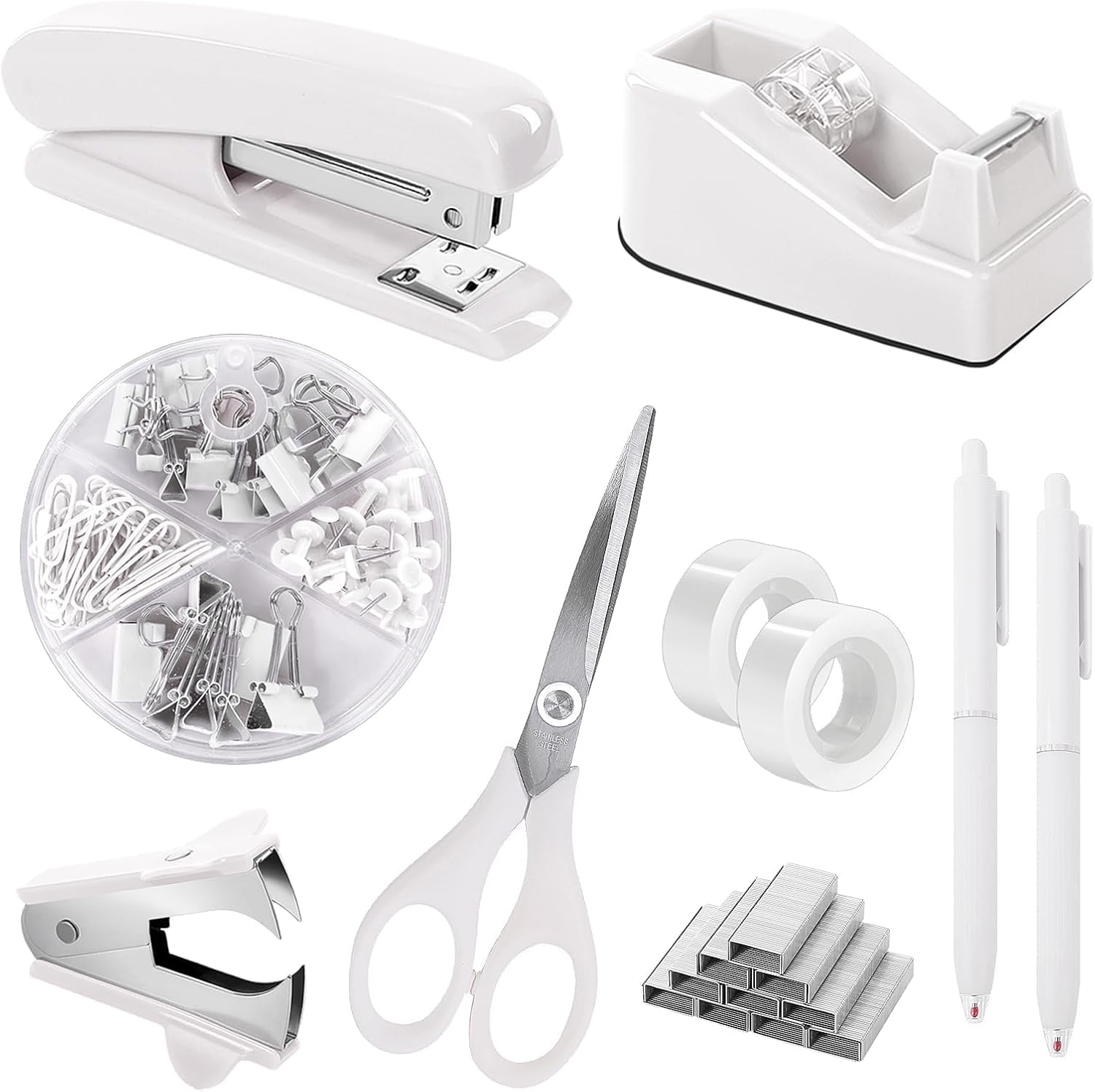 SKYDUE White Office Supplies Set, Desk Accessories, Stapler, Tape Dispenser, Scissors, Binder/Paper Clips and 1000pcs Staples, Office Decor for Women