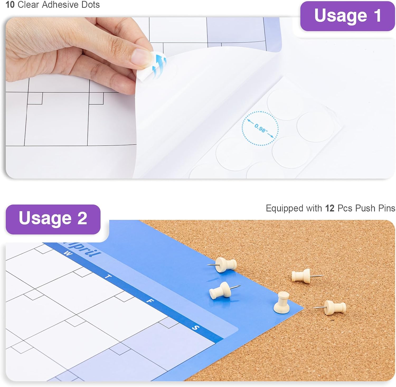 - ⨠Undated Laminated Calendar: This waterproof wall calendar comes with a mini eraser, four dry-erase markers, 10 push pins, and 10 transparent round stickers. The undated monthly calendar can be started at any time, making it perfect for long-term use.