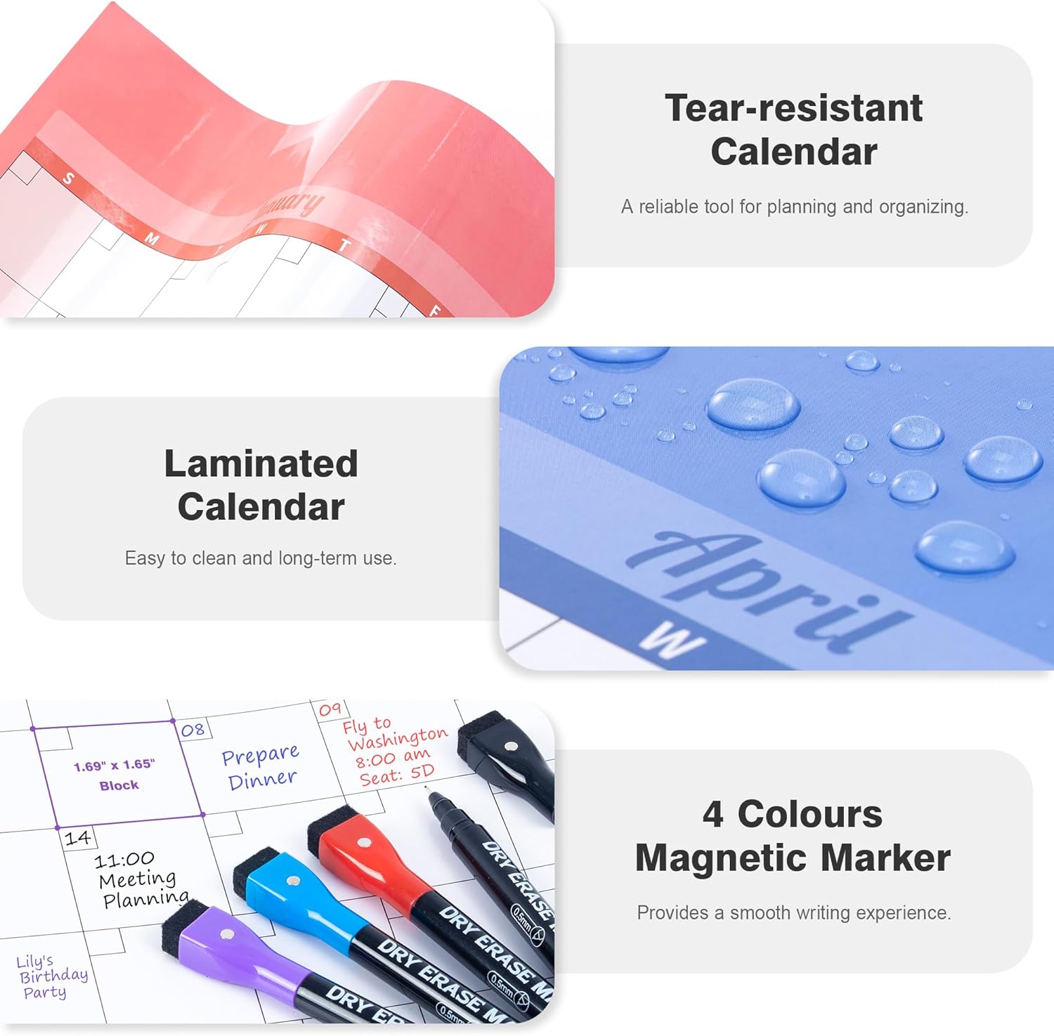- ⨠Dry Erase Wall Calendar : is made of PET Film and 300 grams Copperplate Paper, providing a durable surface that resists scratches and smudges, while the sturdy Copperplate Paper backing keeps it in place without curling.
