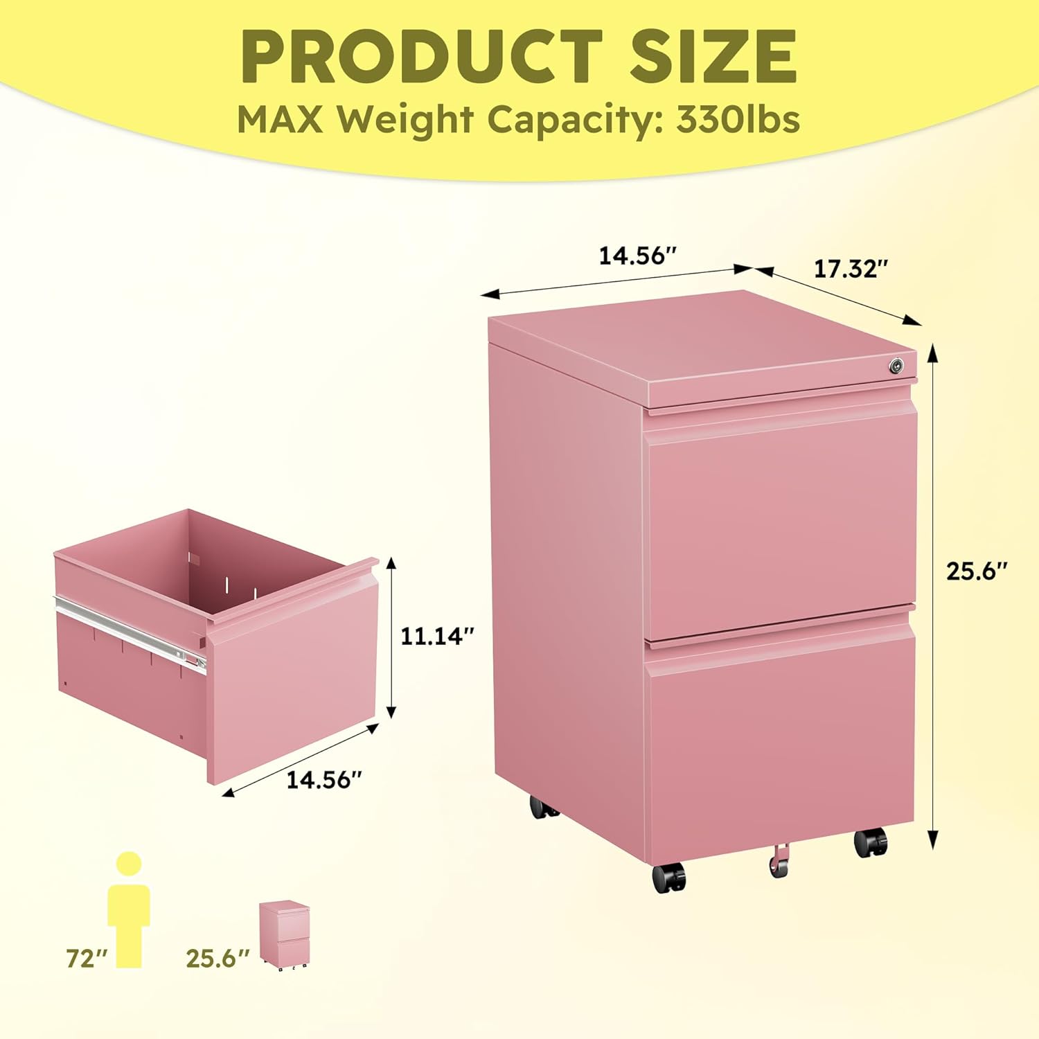 - ăFULLY ASSEMBLED EXCEPT WHEELSăFile cabinet deliver is fully assembled except the casters. Overall Dimension: 14.6" W x 17.3" D x 25.6" H