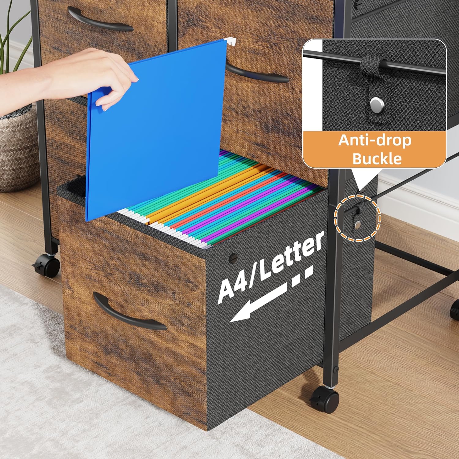 - 【Sturdy & Durable Construction】Built to last, the file cabinet for home office combines a sturdy steel frame with a 1.2X thicker engineered wood board and firm fabric-clad drawers—far sturdier than flimsy alternatives. It ensures long-lasting stability, making it a reliable storage solution for your home or office