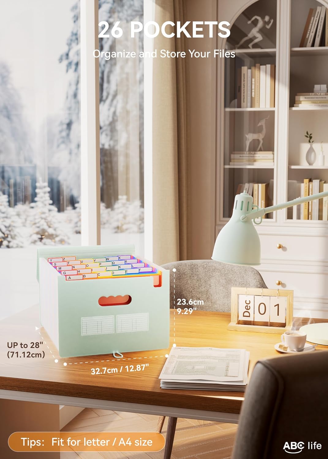 - 【26 Expanding File Folder】ABC life pockets accordian file organizer suitable for filing tax and storing important family documents. Product size is 13 "x 9.4"x 28", top and bottom are both expandable, For letter/A4 size files.