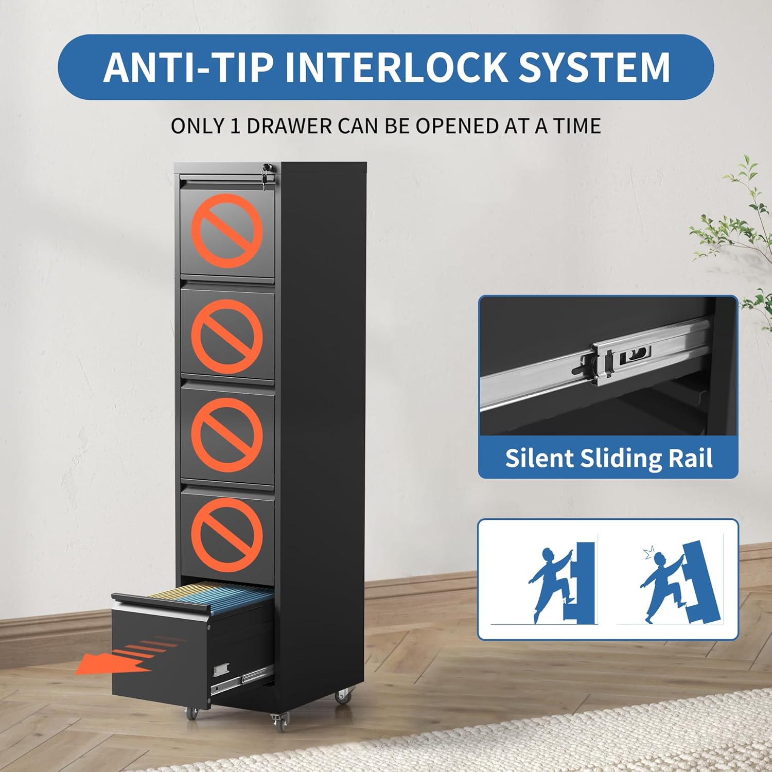 - 【Secure & Anti-tilt Design】Our office filing cabinets with 5 drawer feature a locking mechanism and anti-tip feature. When one drawer is opened, the interlocking drawer system prevents the other drawers from opening, preventing tip-overs and increasing safety.