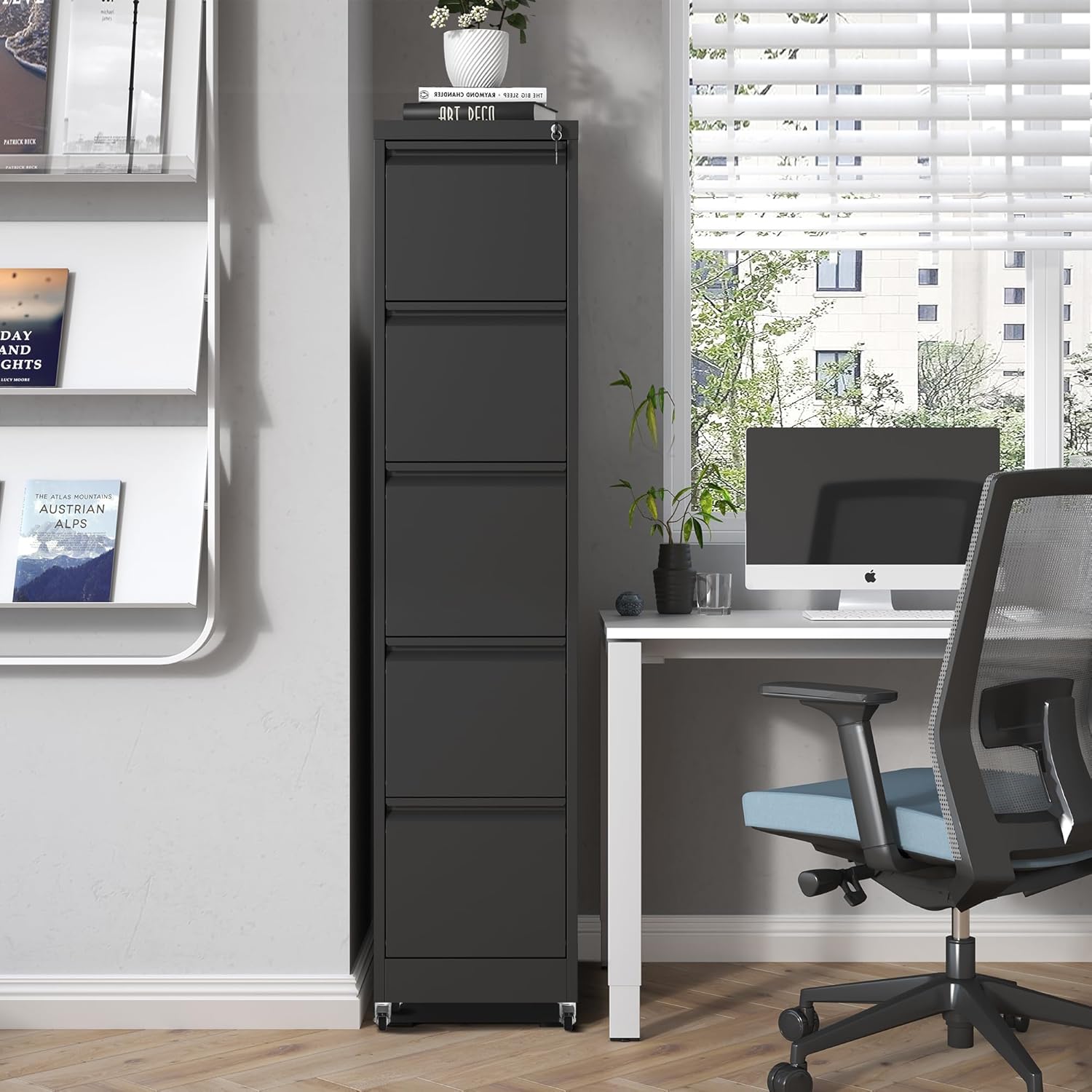 - 【User-Friendly Design】 The 5 drawer mobile filing cabinet equipped with 2 keys, when you leave the office, you can lock 5 drawers at once, to ensure your privacy and file security. And it built-in slide rail, drawer open and close smoothly, quiet, suitable for use in the office environment. The wheels can rotate 360° for easy movement.