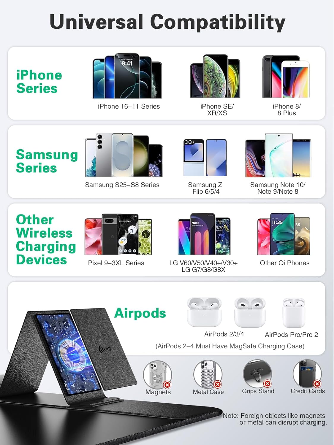 - β Mouse Pad with Phone Holder: Mousepad built-in 15W fast wireless charging function. Compatible with iPhone 17/16/15/14/13/12/11/X/XR/XS/8 series, Samsung Galaxy S23/S22/S21/S20/S10/S9/S8/Note 9/8 and other smartphones that support wireless charging; Airpods 3rd/ Airpods Pro 2nd/Airpods Pro and other Qi enabled devices. (Note: 15W fast charging requires 18W/20W Power Adapter, which is not included in the this Mousepad.)
