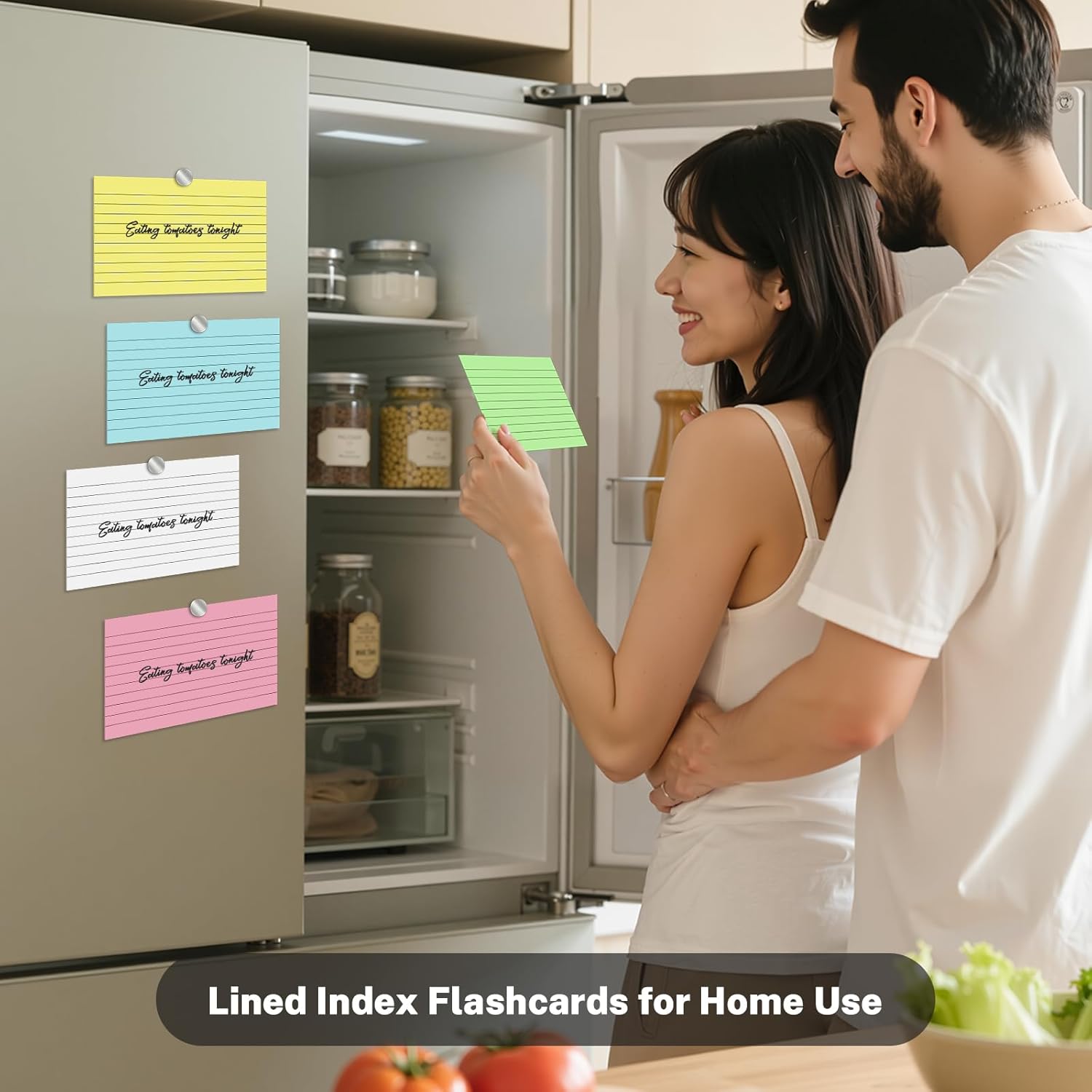 - Premium 180 GSM Colored Index Cards: 3 x 5 ruled index cards feature 6 vibrant colors (pink/blue/green/purple/yellow/white) with 600 sheets total (50 per pad), sufficient number to meet your daily study and work needs. The heavyweight 180gsm paper resists ink bleed-through.