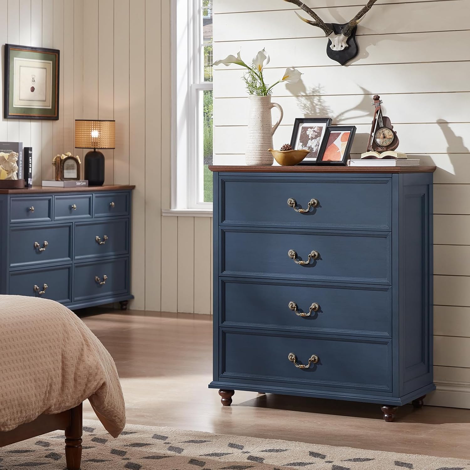 Farmhouse 4 Drawer Dresser for Bedroom, 37" Tall Rustic Chests of Drawers w/ 4 Solid Wood Feet, Mid Century Modern Wooden Closet Storage Dressers Organizer for Living Room, Hallway, Navy Blue