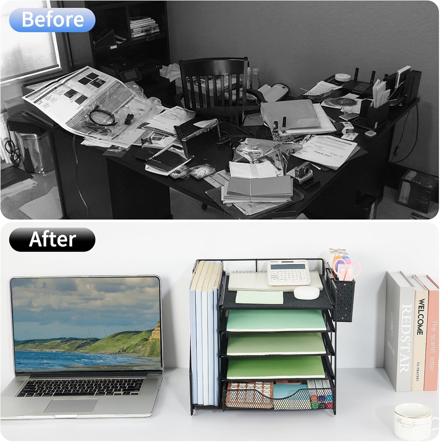 - 【Versatile Storage】This desktop organizer features 5 cardboard trays and a vertical file holder for sorting documents and notes. The included pen cup and drawer provide dedicated storage for all your office accessories.