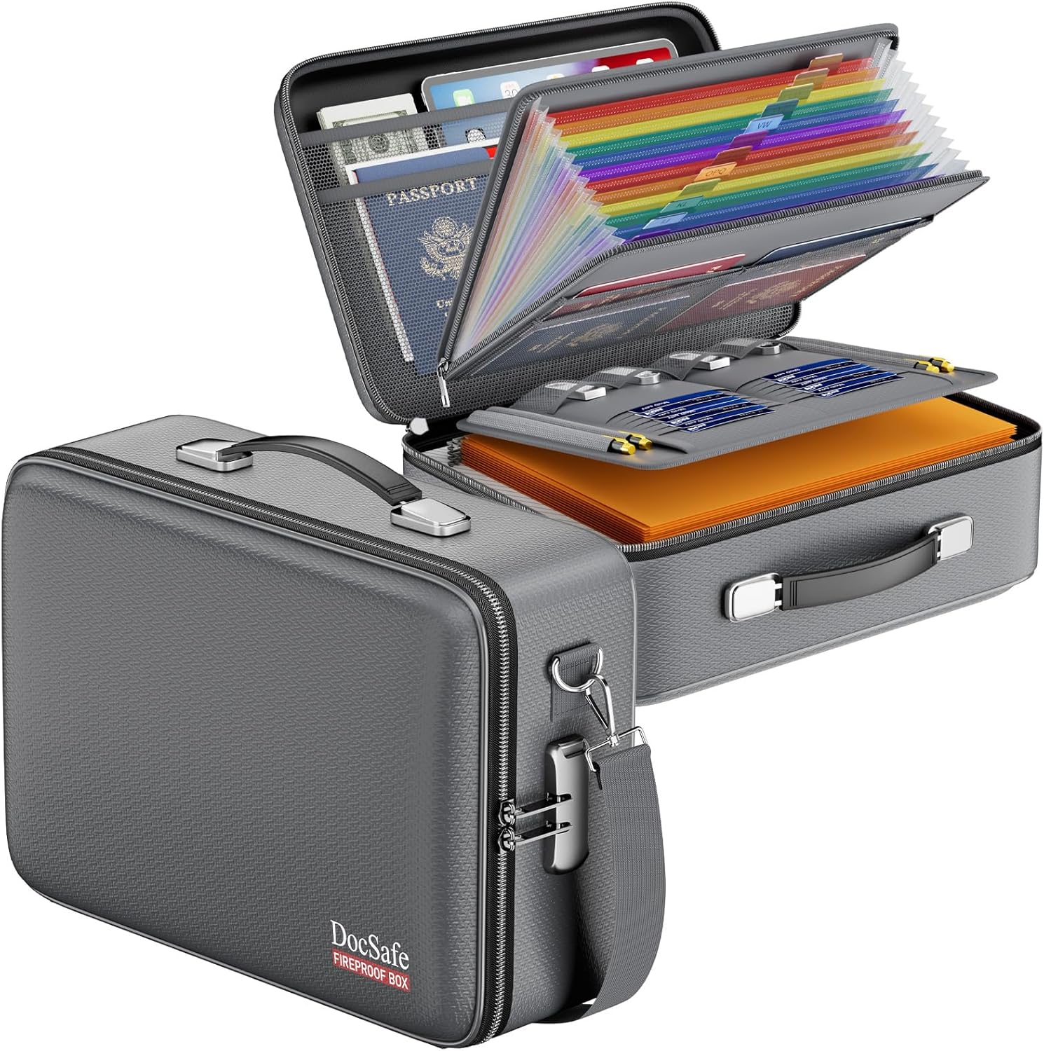 - Fireproof Box with Lock: Protect your valuables with the built-in high-quality combination lock (No keys required). Design with a strong handle&a detachable shoulder strap for carrying everything you needed easily. The fireproof box is suitable for business, travel, office, school, home storage, of course, giving it as a gift to your family is also a good choice. Fireproof box is both fireproof and water-resistant, ensuring your documents stay protected during fires, floods, or wet weather