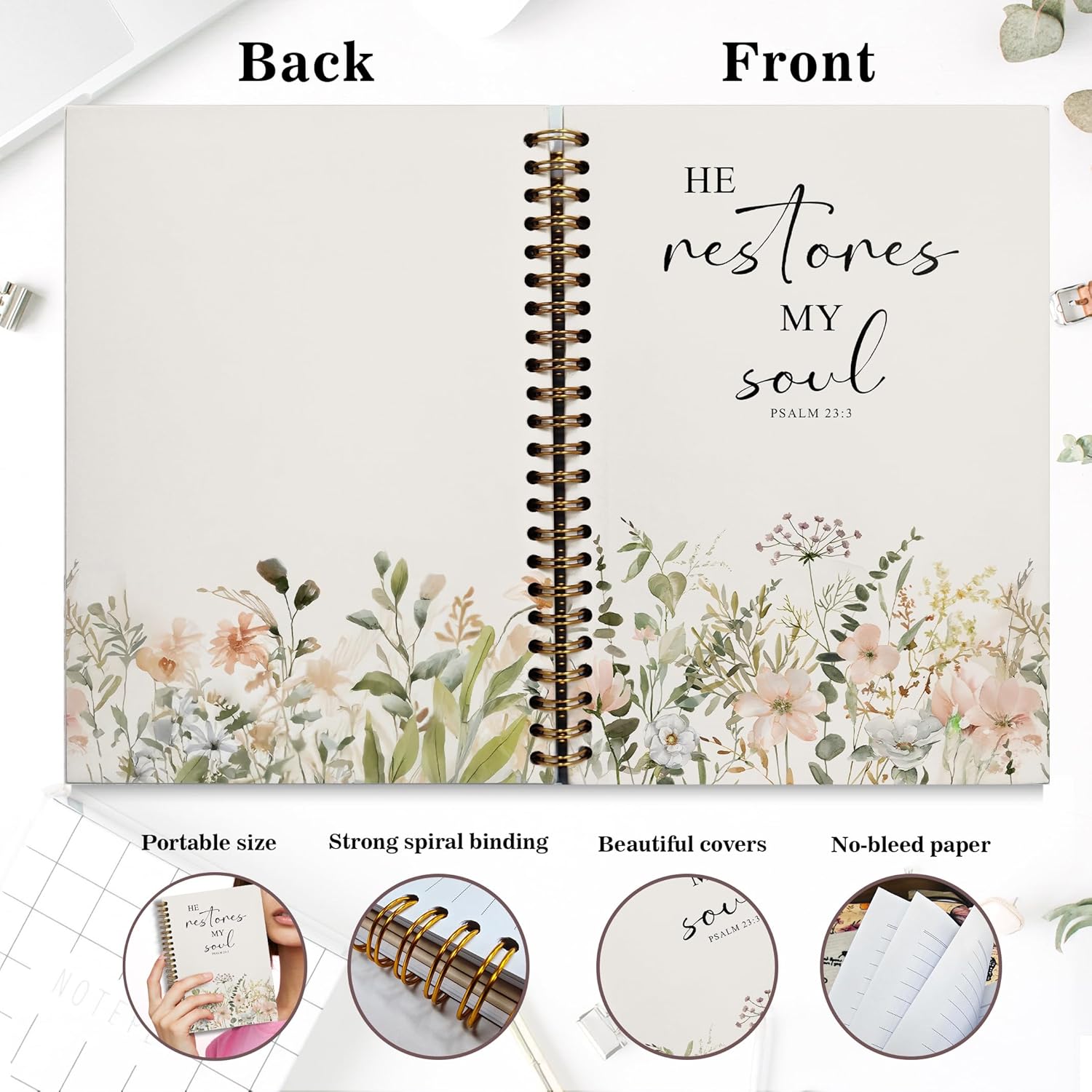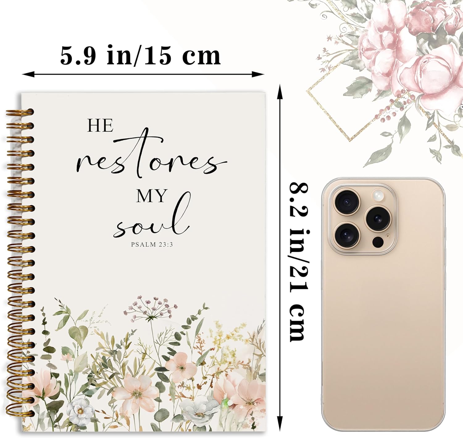Bible Notebook, A5 Spiral Christian Journal with Floral Notebook, Bible Verse-He Restores My Soul, Inspirational Notebooks for Women, Bible Study, Gift for Birthday Christmas, Office Supplies (White)
