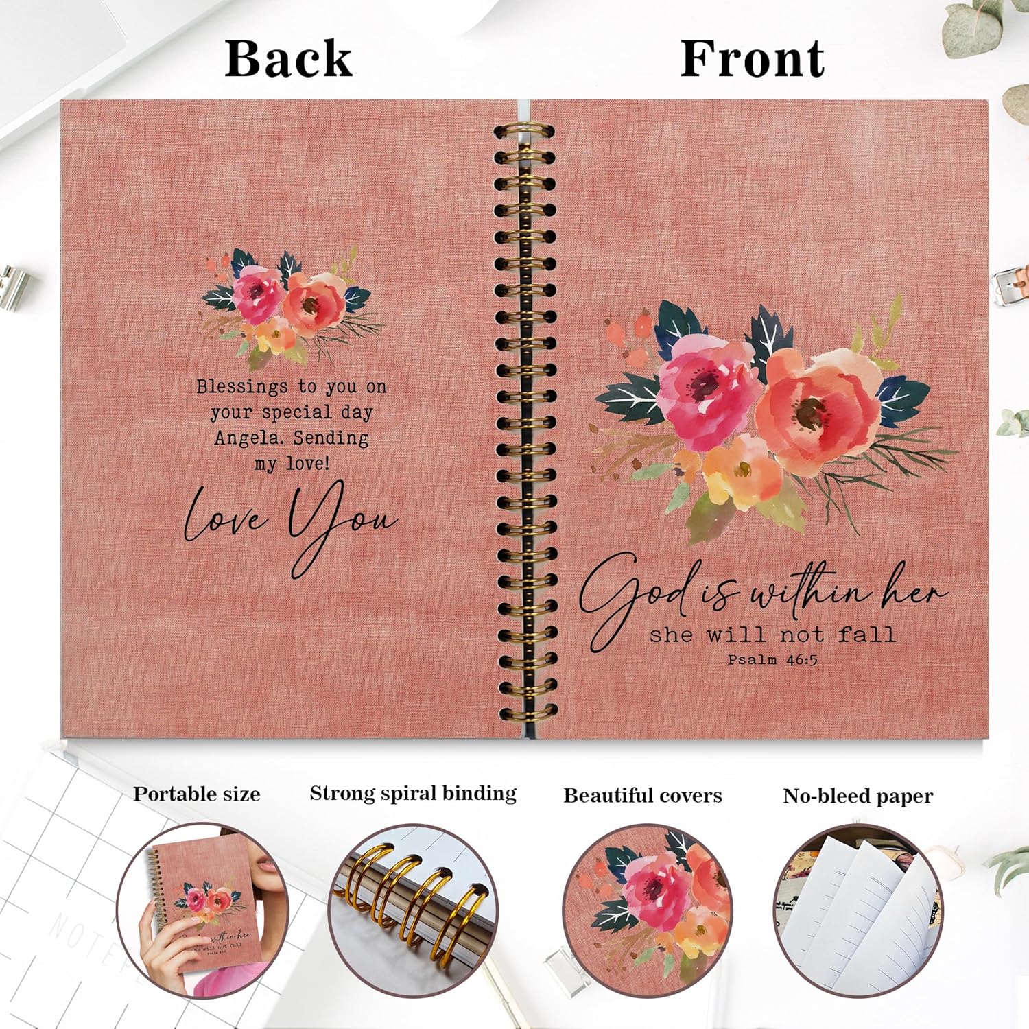 - 2.Bible Journaling Hardcover Spiral Notebook The notebook has a double spiral design, the sturdy spiral binding allows the notebook to lay flat, making it easy to write on both sides of the page. made of thick paper, prevents ink from leaking, safe, easy to write