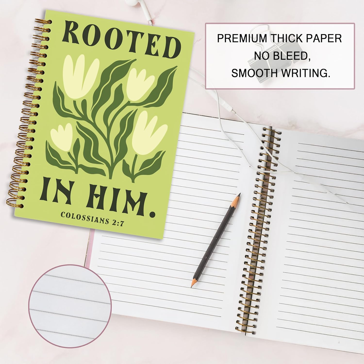 Bible Journal, A5 Spiral Christian Bible Green Flower Notebook, Rooted in Him, Bible Verse Gift for Women Men Birthday Christmas, Sunday School, Office Supplies, Bible Study (Green-flower)