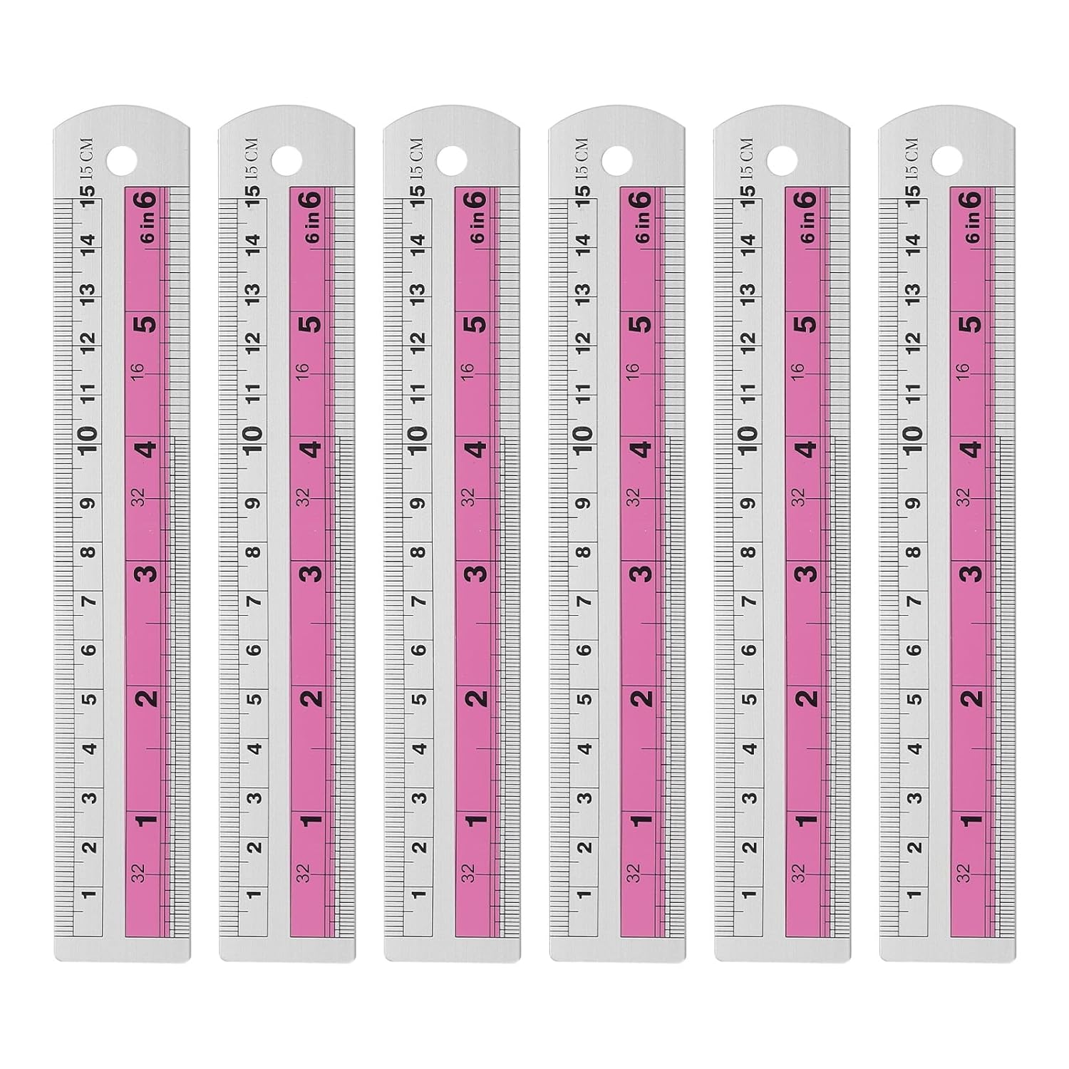 HARFINGTON 6pcs Metal Straight Ruler 15cm Metric SAE Aluminum Alloy Measuring Rulers Scale Tools with Hole for Measure Study Reading Classroom Office, Pink