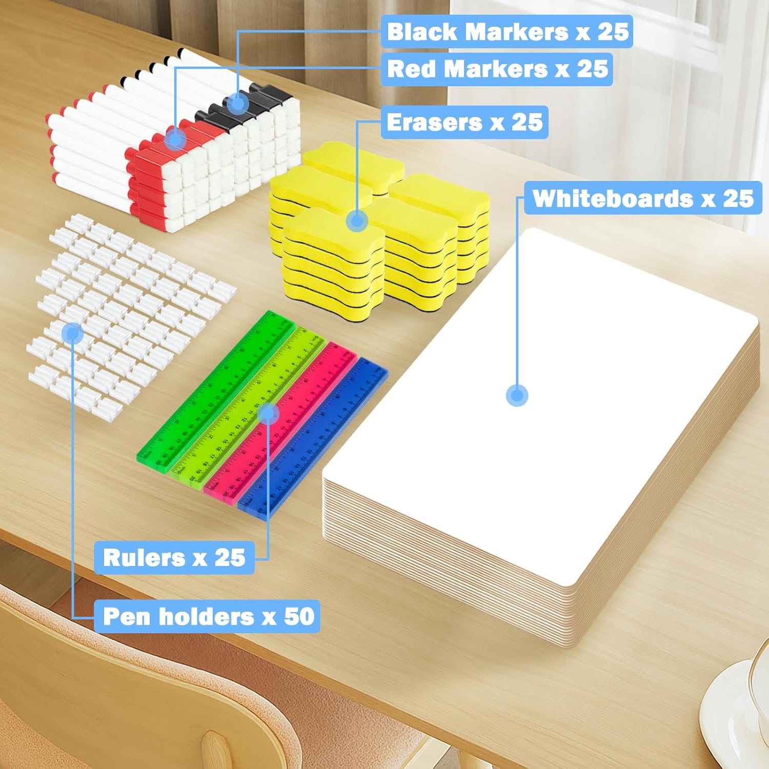 25 Pack Dry Erase Boards 9'' x 12'' Mini Double-Sided Whiteboards Safe Rounded Edges, Includes 25 Erasers, Markers, Rulers & 50 Clips, Perfect for Students, Teachers, School & Office Use