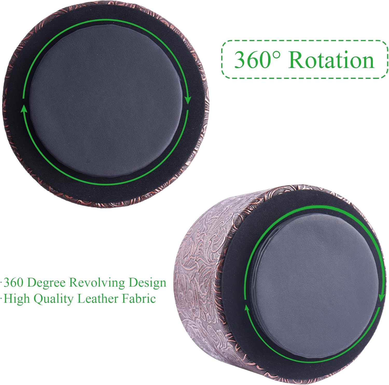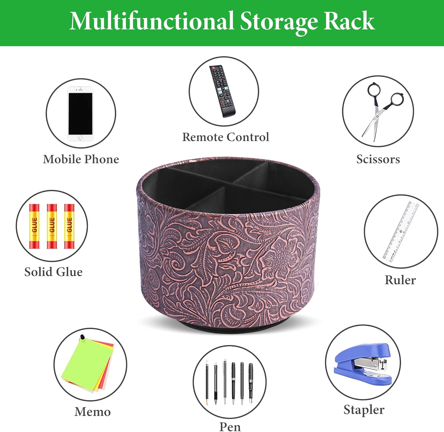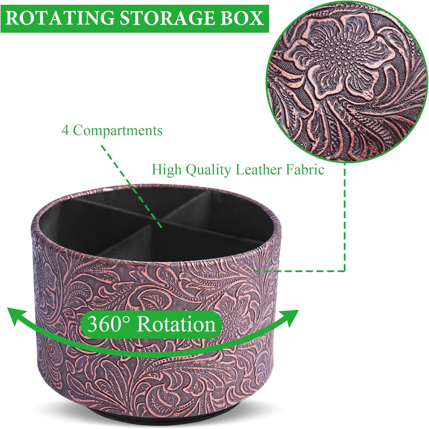 lizimandu Round Leather Art Supply Organizer,Remote Control Holder,360 Degree Spinning,Multi-Functional Pencil Holder,4 Compartments Desktop Stationary Organizer(1-Carved Cooper Red)