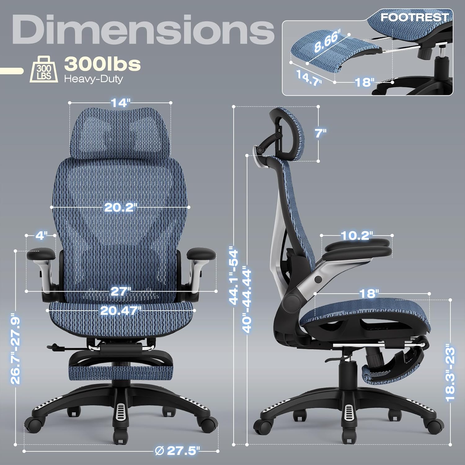 - 【Certified Safety & Support】BIFMA-certified construction with heavy-duty 300lbs capacity, including Grade-4 gas lift and step-on footrest-equipped nylon base + whisper-quiet rolling casters