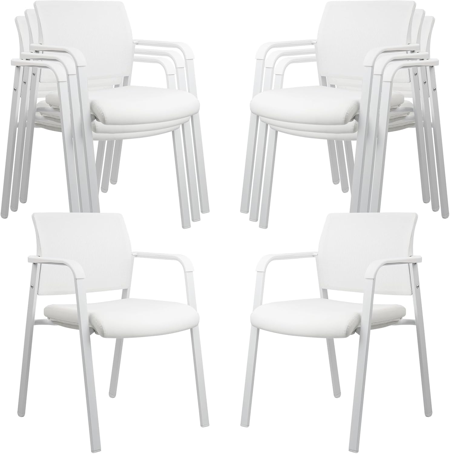 CLATINA Stacking Office Chairs | Mesh Back, Thicken Leather Seat and Arms, Ergonomic Lumber Support | Guest Reception, Waiting, Conference, School, Party, Customer, Side, Stationary | Set of 8, White