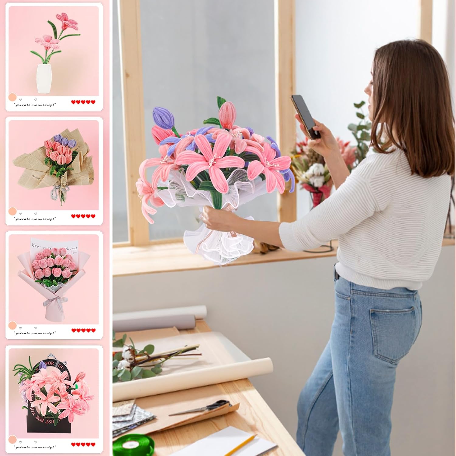500 PCS Pipe Cleaners Craft Kit for Flower Making Lily DIY Material Bundle with 20 Stems, 100 Stamens, Ribbon, Tulle, Glue Sticks & Step-by-Step Guide Vibrant Colors, Non-Shedding, Fade-Resistant
