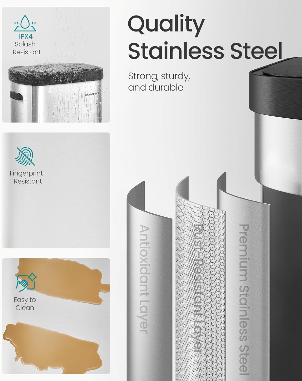 - Built to Last: Crafted with a stainless steel body, this automatic garbage can is rust-resistant and easy to clean. Its IPX4 splash-resistant design ensures enduring use