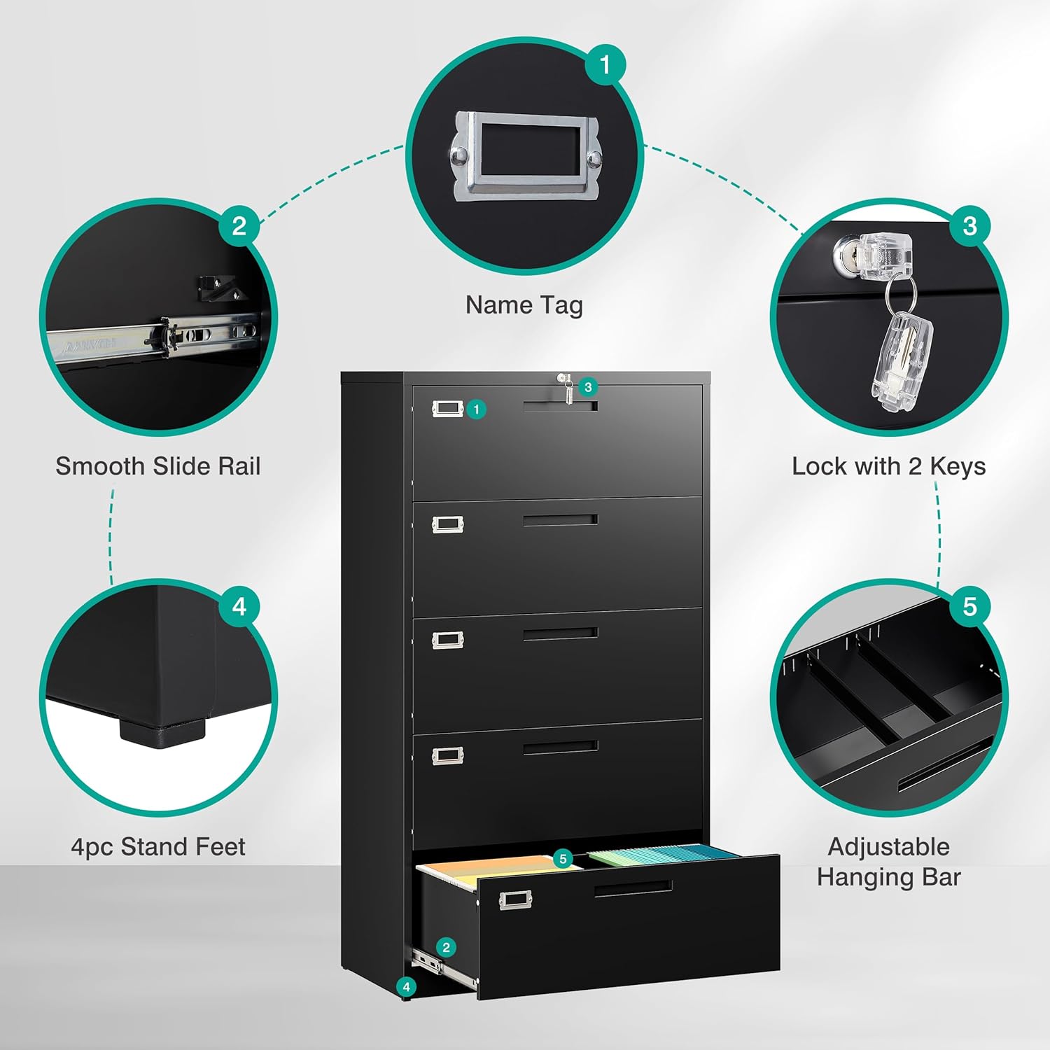 SISESOL 5 Drawer Lateral File Cabinet with Lock,Black Lateral Filing Cabinet,Horizontal Metal Filing Cabinets,Large Locked Wide Five Drawer File Cabinets for Office Home,Fit A4/F4/Letter/Legal File
