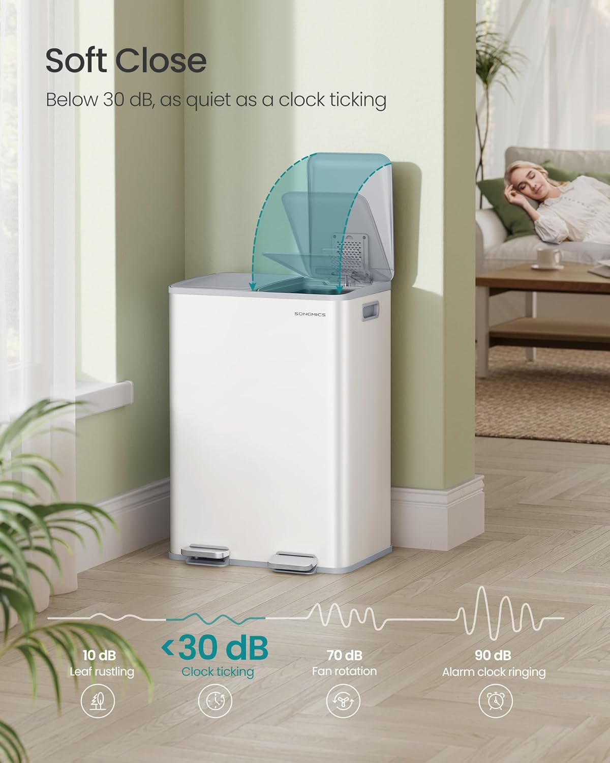 SONGMICS Trash Can, 2 x 8 Gallon (2 x 30 L) Dual-Compartment Garbage Can with Soft-Close Lid, Pedal and Inner Buckets, Stainless Steel, Includes 15 Liner Bags, Matte White ULTB741W01
