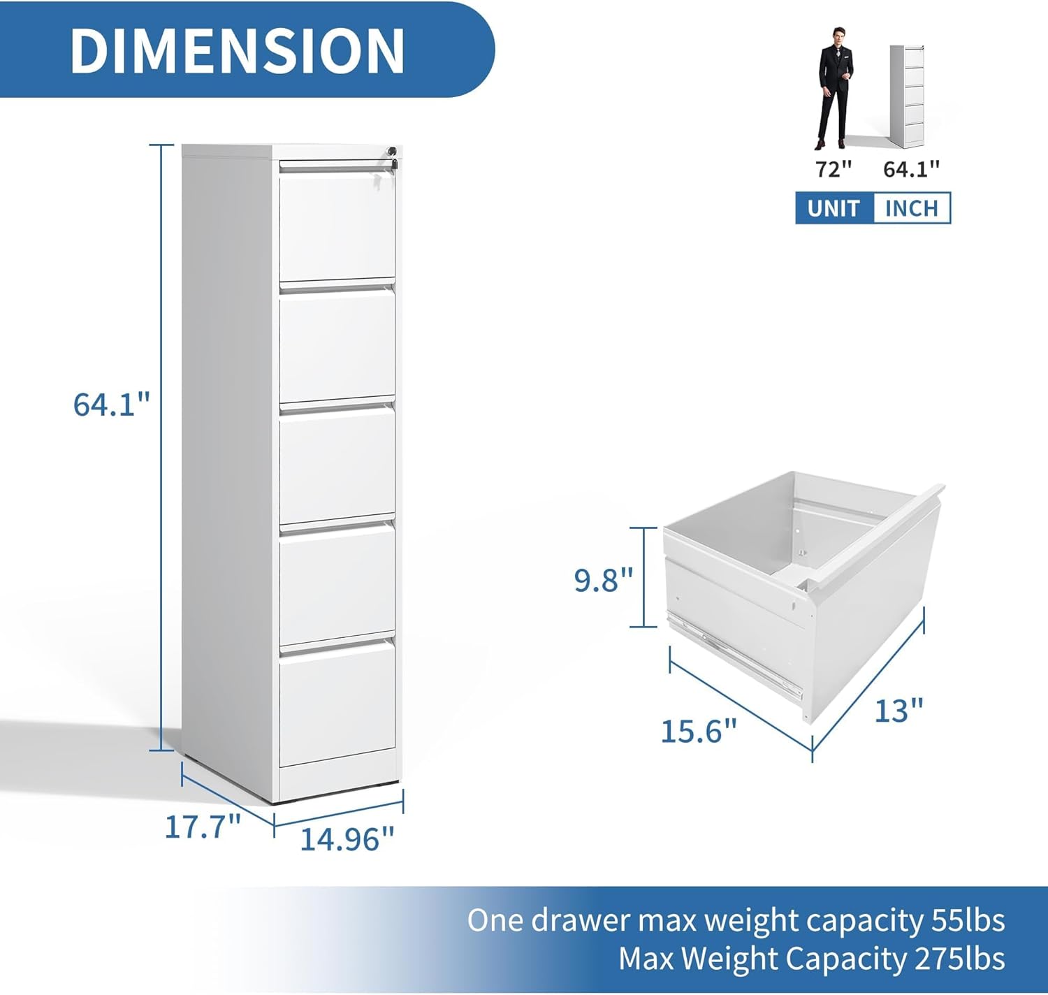 5 Drawer File Cabinet with Lock,Metal Vertical Filing Cabinets for Home Office,Heavy Duty File Storage Cabinet for Letter/Legal/A4/F4 Size File,Assembly Require (White, Vertical 5 Drawer)