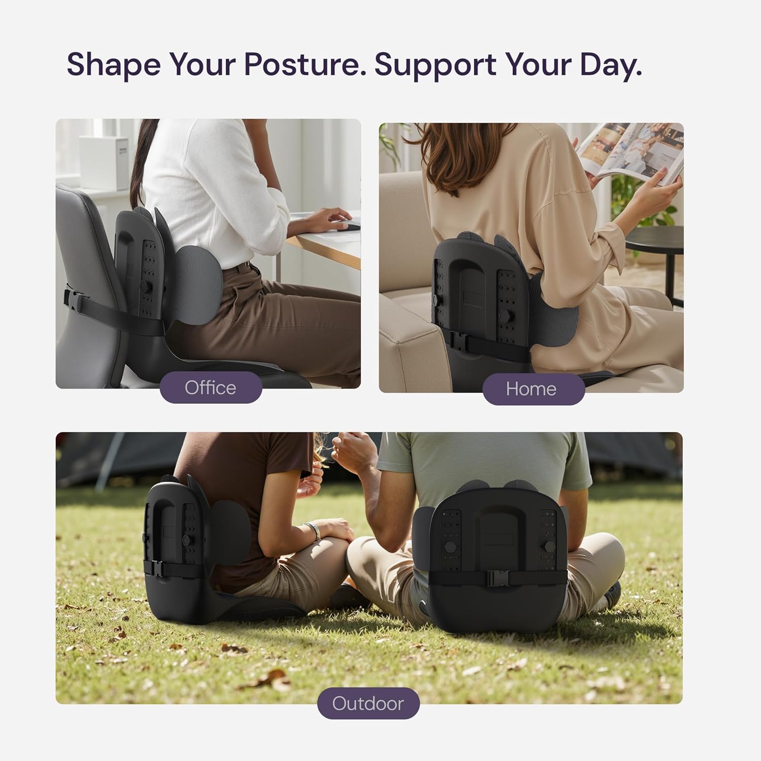 - PATENTED 3D SPINE SUPPORT – Two piece back support frame wraps your lumbar and thoracic spine, tips your pelvis into a neutral position, and encourages an effortless, upright posture the instant you sit down. Slide the back support onto any chair or seat you've got an instant upgrade.