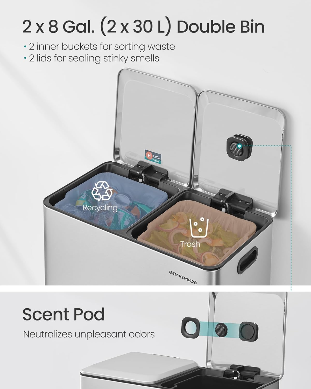 - Ready to Use: This double trash can includes 15 trash bags for immediate use and is compatible with SONGMICS 8-gallon trash bags (code H). The inner bucket features a bag hole to keep liners securely in place