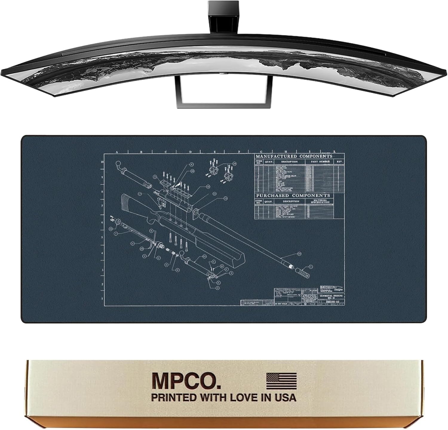 MPCO. Blueprints Large Gaming Desk Pad - 36" x 17" Duraglyde Fabric Browning 50 Cal – Blue Desk Mats - Non-Slip, Washable, Smooth Glide for Precision Gaming & Work