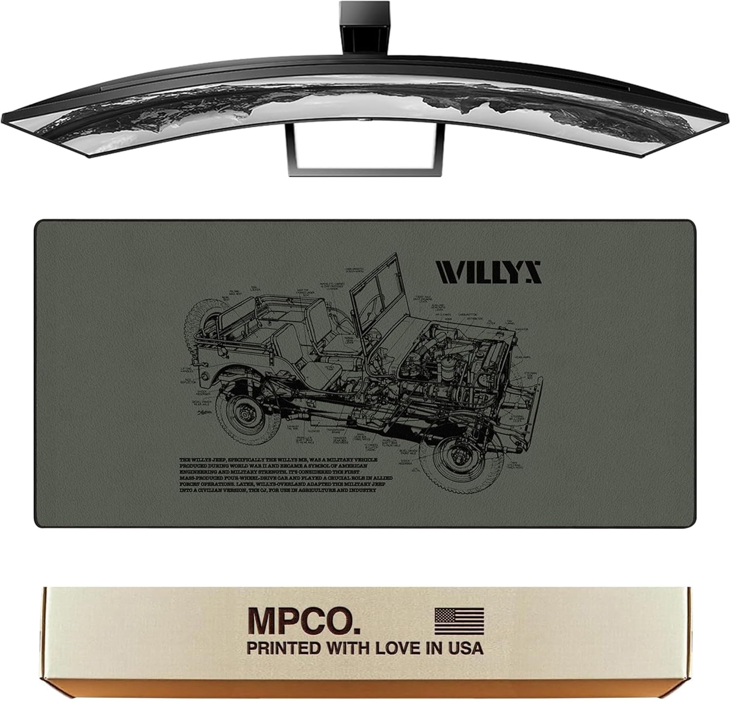MPCO. Blueprints Large Gaming Desk Pad - 36" x 17" Aeroglyde Fabric Willys Jeep – Green Desk Mats - Non-Slip, Washable, Smooth Glide for Precision Gaming & Work