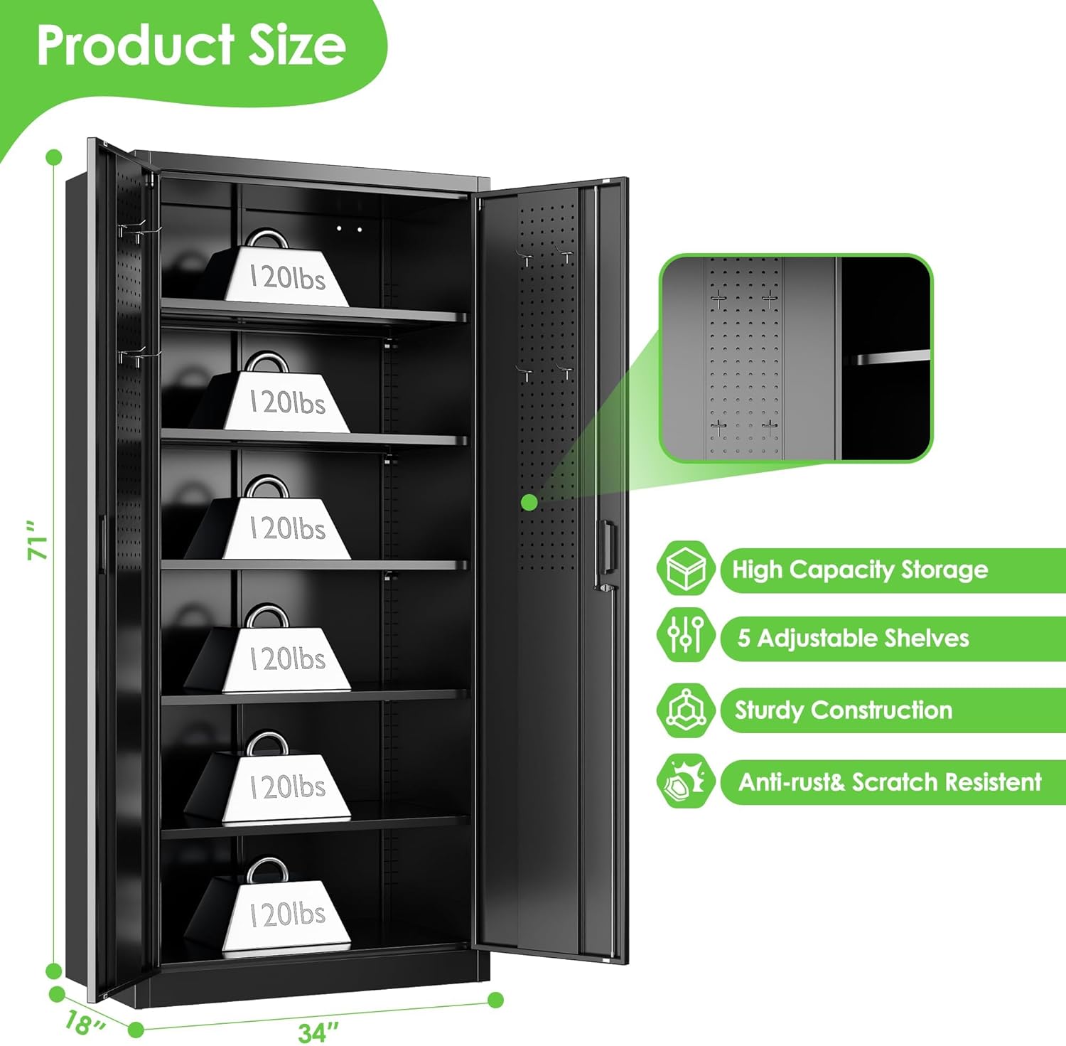 Aobabo Upgraded 71" H×34" W×18" D Metal Garage Storage Cabinet with Pegboards, Lockable Steel Cabinet with 5 Adjustable Shelves and 4 Hooks for Garage, Home, Office, Black,Assembly Required
