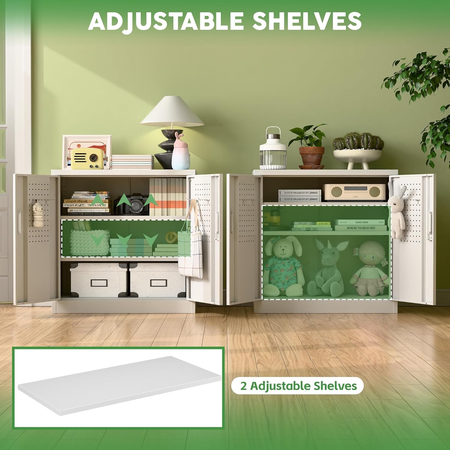 - [Adjustable Shelves] Metal garage storage cabinet has 2 adjustable and removable shelves, which can offer you flexible space. Each shelf of the storage cabinet can hold up to 120lbs.