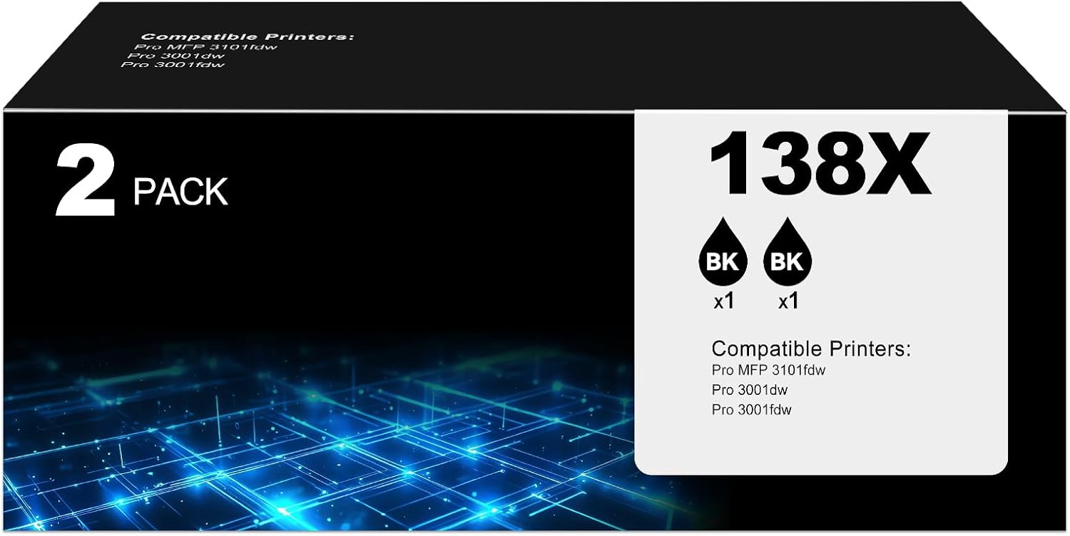 - Compatible for HP 138X Black Toner Cartridges 2 Pack Printer Model:for hp 138X black Toner Cartridges Compatible for hp color Laser pro mfp 3101fdw toner, color Laser pro 3001dw toner, Laser Pro MFP 3101sdw, color Laser pro 3001fdw toner