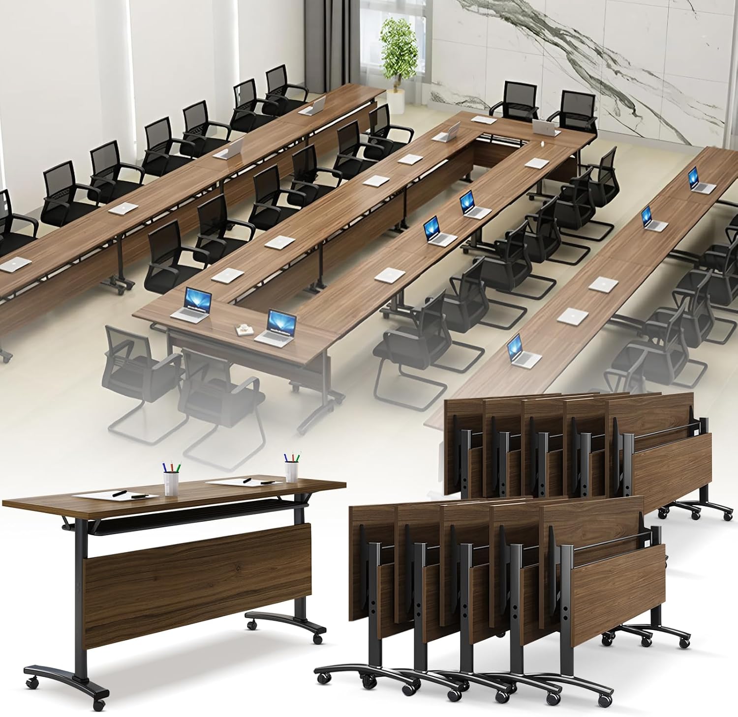Folding Conference Room Table, Modern Conference Tables with Wheels, Large Rectangular Mobile Training Tables for Office Classroom, Foldable Modular Boardroom Seminar Table Walnut (10pack L63in)
