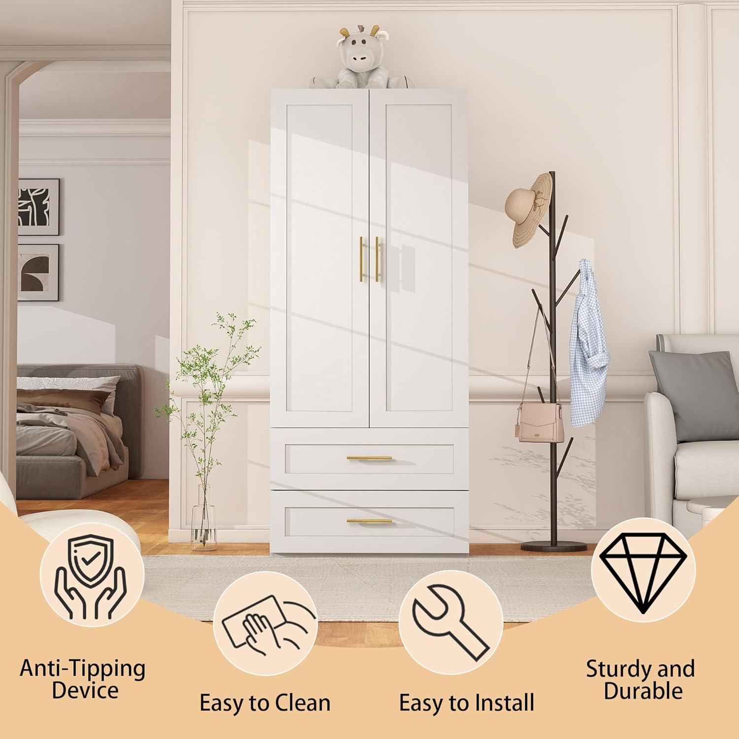 - Premium Materials: Crafted from high-quality engineered wood, the wardrobe with drawers and shelves offers lasting durability. The surface of the white closet with doors is specially treated to resist wear and scratches while being easy to clean, ensuring it stays looking great even with everyday use. For added safety and stability, the free standing closet with doors includes an anti-tip device—making it especially suitable for homes with children or pets.