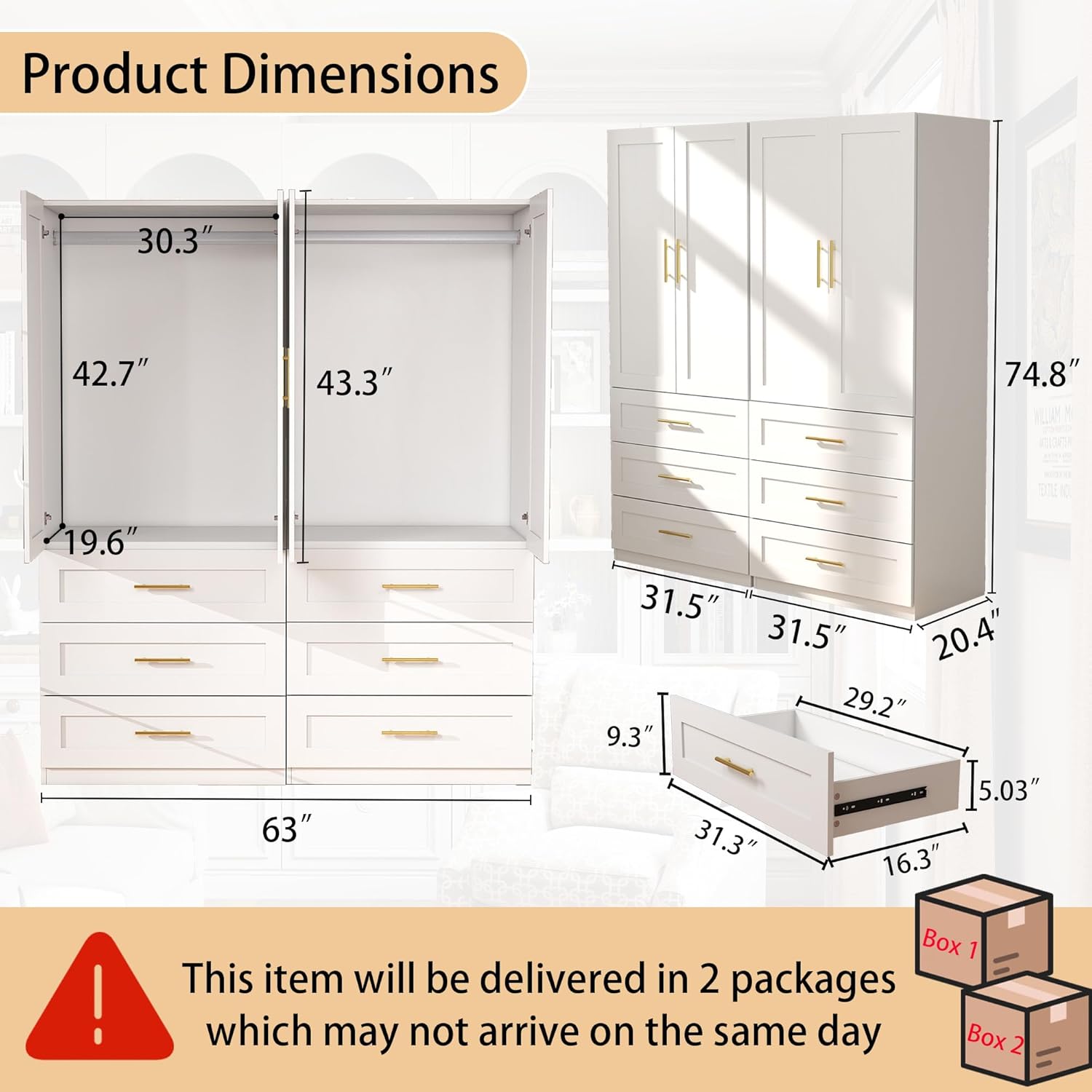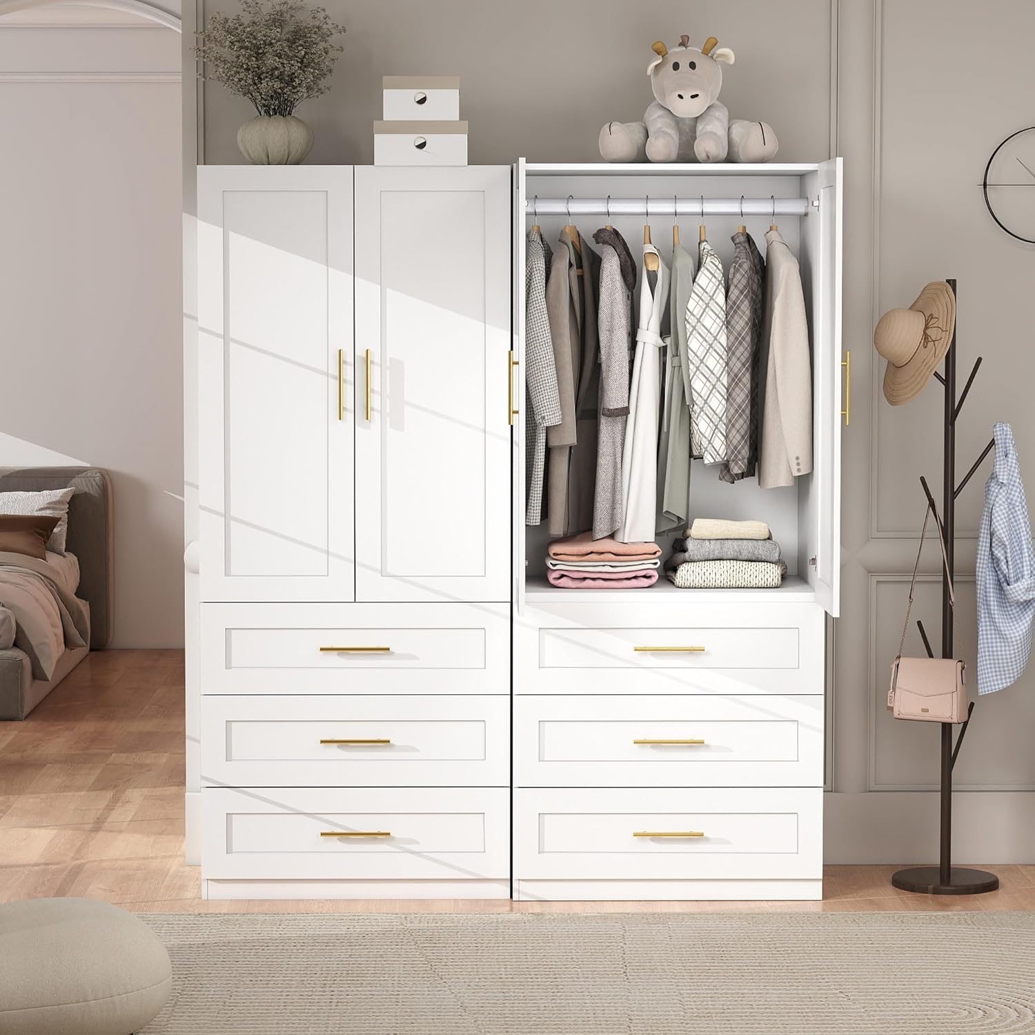 - Versatile Storage Space:The closet cabinets with doors and shelves features a thoughtfully designed upper-lower partition structure. The closet wardrobe with drawers includes a dedicated hanging area that easily accommodates long coats or dresses. Additionally, the bedroom closet cabinet comes equipped with spacious drawers to organize everyday clothing, bedding, or personal items—perfect for meeting the storage needs of different family members.