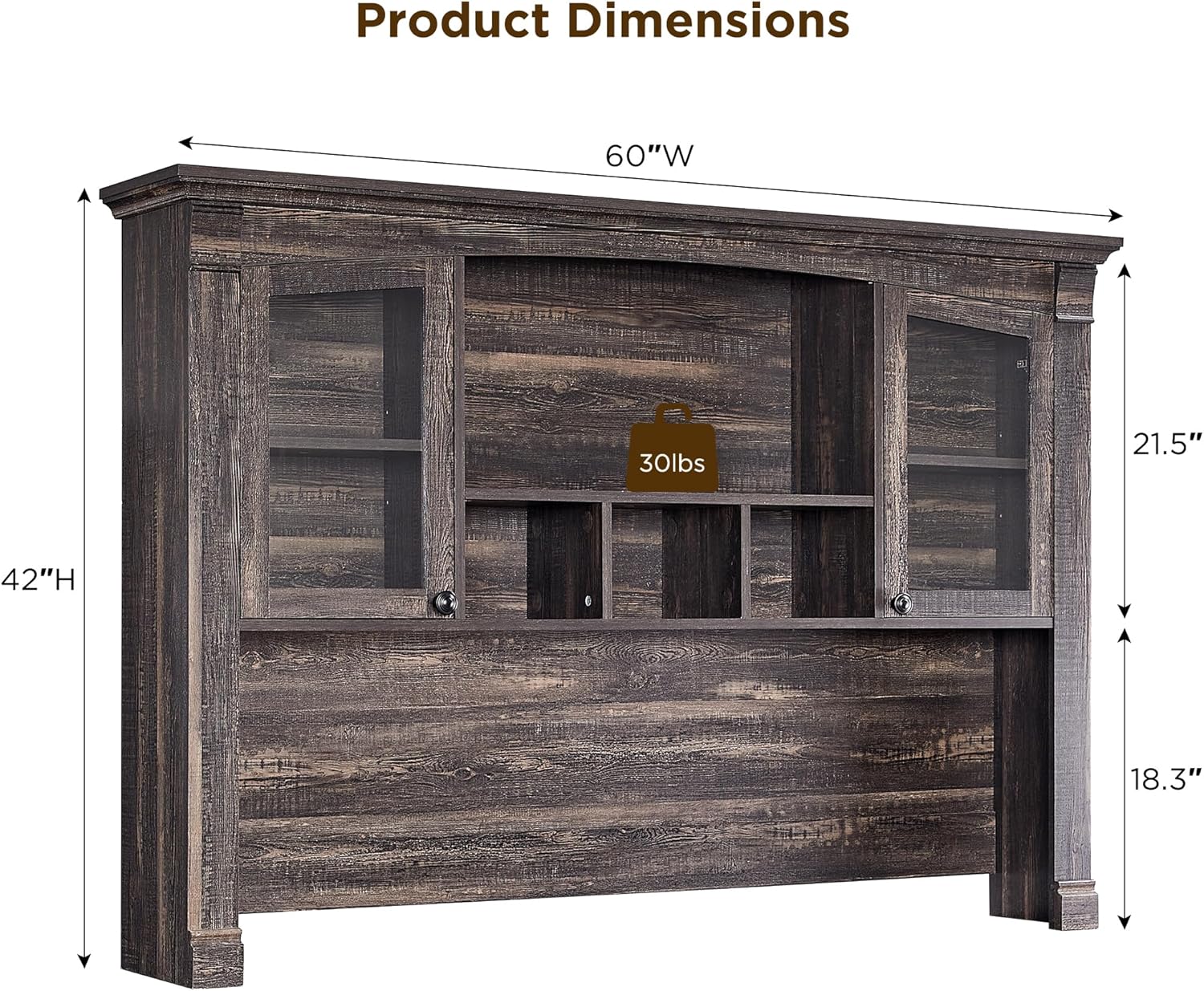 OKD Farmhouse Hutch for 60" Executive Desk, Office Desk Storage Cabinet with Glass Doors and Shelves, Top Hutch Organizer for Home Office - Dark Rustic Oak