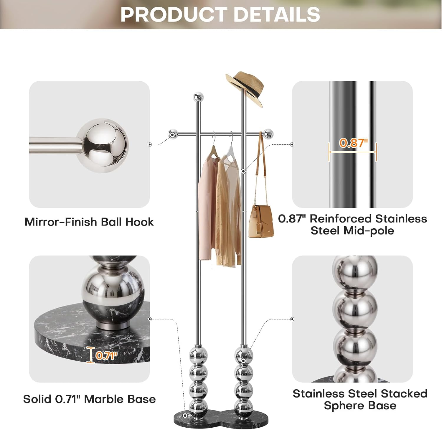 - 【Durable Stainless Steel Frame】 Unlike common iron coat racks, the Chrome-nickel Stainless Steel frame is enhanced with a electroplated polished finish. Its smooth Glossy surface is rust- and corrosion-resistant, offering long-lasting durability. While the double rod structure with the stainless sliver balls increases load capacity up to 200lbs, perfect for hanging multiple garments