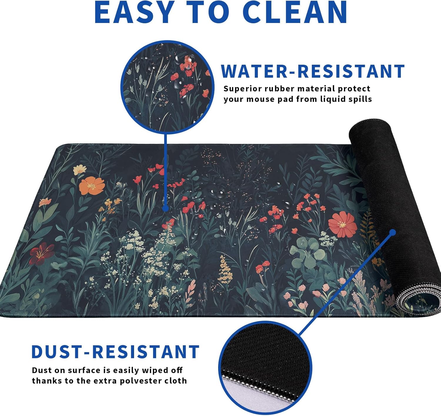 • ♄[Easy To Clean]:This large Flower mouse pad for desk, Spill-proof coating protects your desktop from spilled water, Drinks, Ink and the other liquid spilled liquid or other accidents.Easy to clean, Just wipe with a wet cloth or paper, Does not fade and can be washed and foldable without leaving creases, Easy to carry.