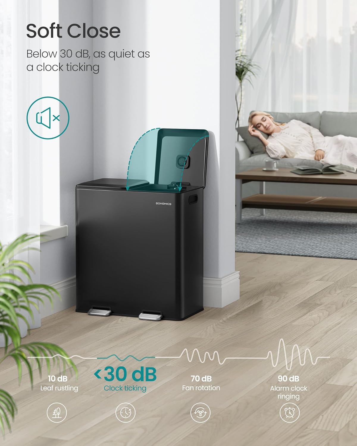 - Hands-Free, Silent, Fresh: The pedals allow for hands-free opening, while the soft-close lids ensure quiet use without loud clangs. The scent pods in the lids neutralize unpleasant odors